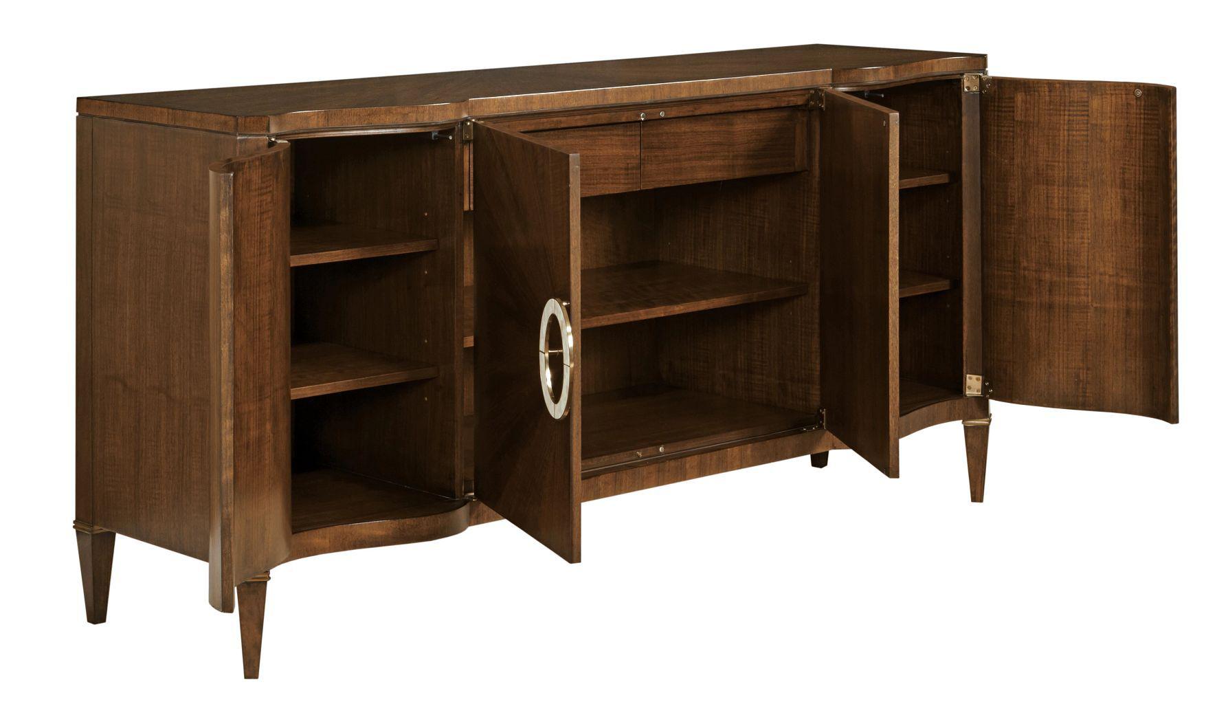 Прекрасный буфет, выполненный в традиционном переходном стиле. Здесь классические нотки переплетаются с мотивами современности. Дизайн искусно сочетает в себе отборный фигурный шпон ореха с бронзовыми вставками из нержавеющей стали. Четыре распашные дверцы, за центральными дверцами расположилась одна регулируемая полка и два выдвижных ящика. Еще по две полки разместились за боковыми дверцами. Регулируемые выравниватели, выходы для шнура и ручки в задней части футляра.