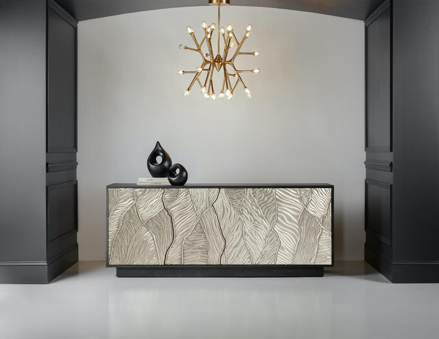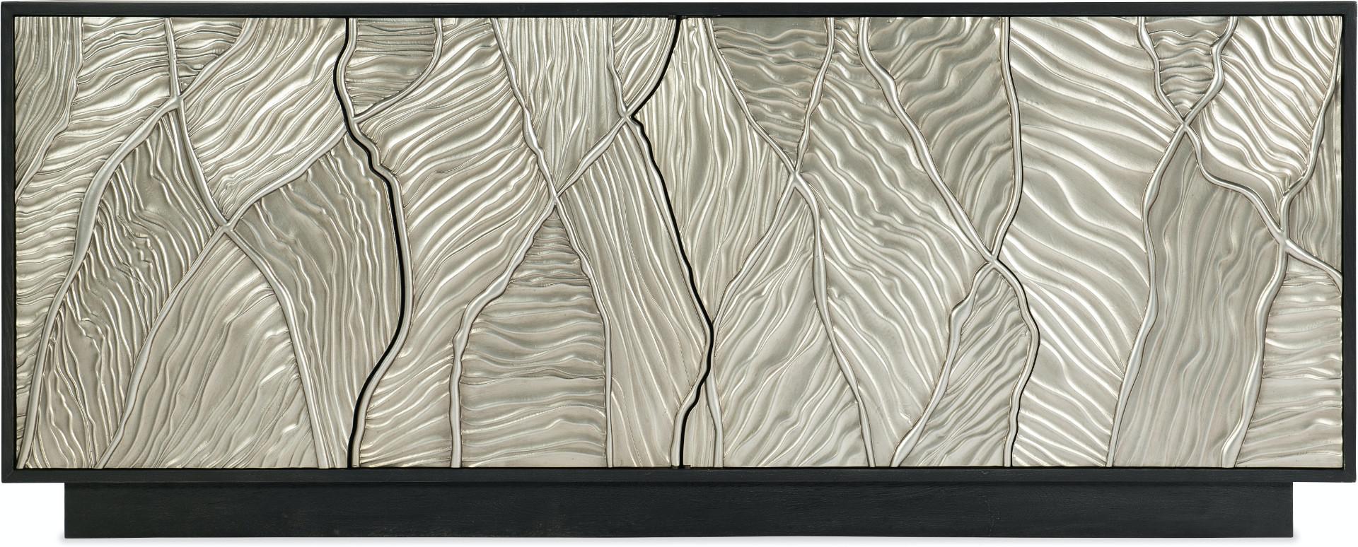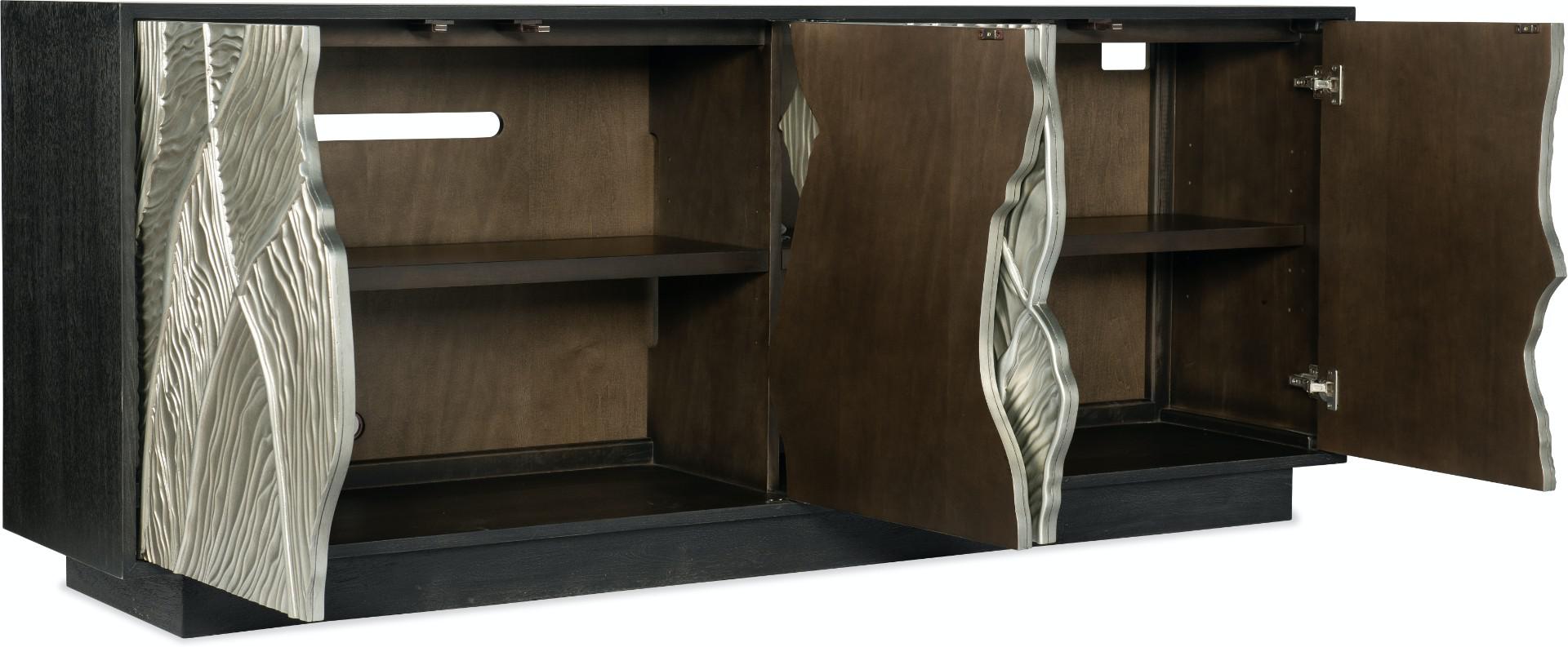 Весьма интересный вариант тумбы ТВ, выполненной в переходном стиле. Тумба изготовлена из дубового шпона и дополнена стильными серебряными фасадами дверей. Рельефный узор, изображенный на фасадах дверей добавляет тумбе особый шик и некую изюминку. Четыре двери оснащены сенсорными защелками. За каждой парой дверей - одна регулируемая полка. Вентилируемая задняя панель.