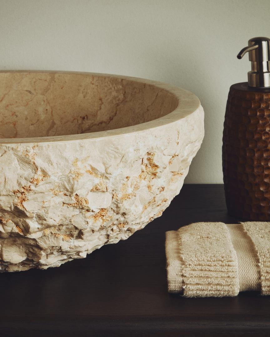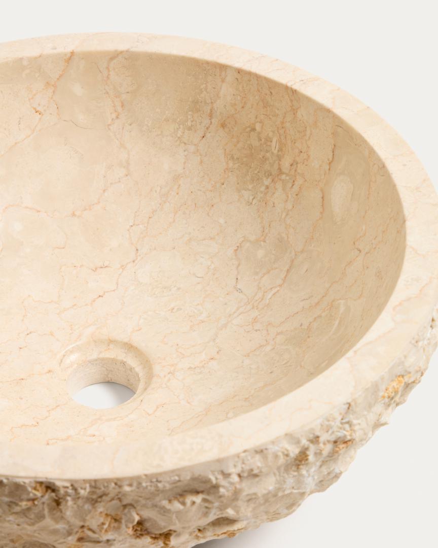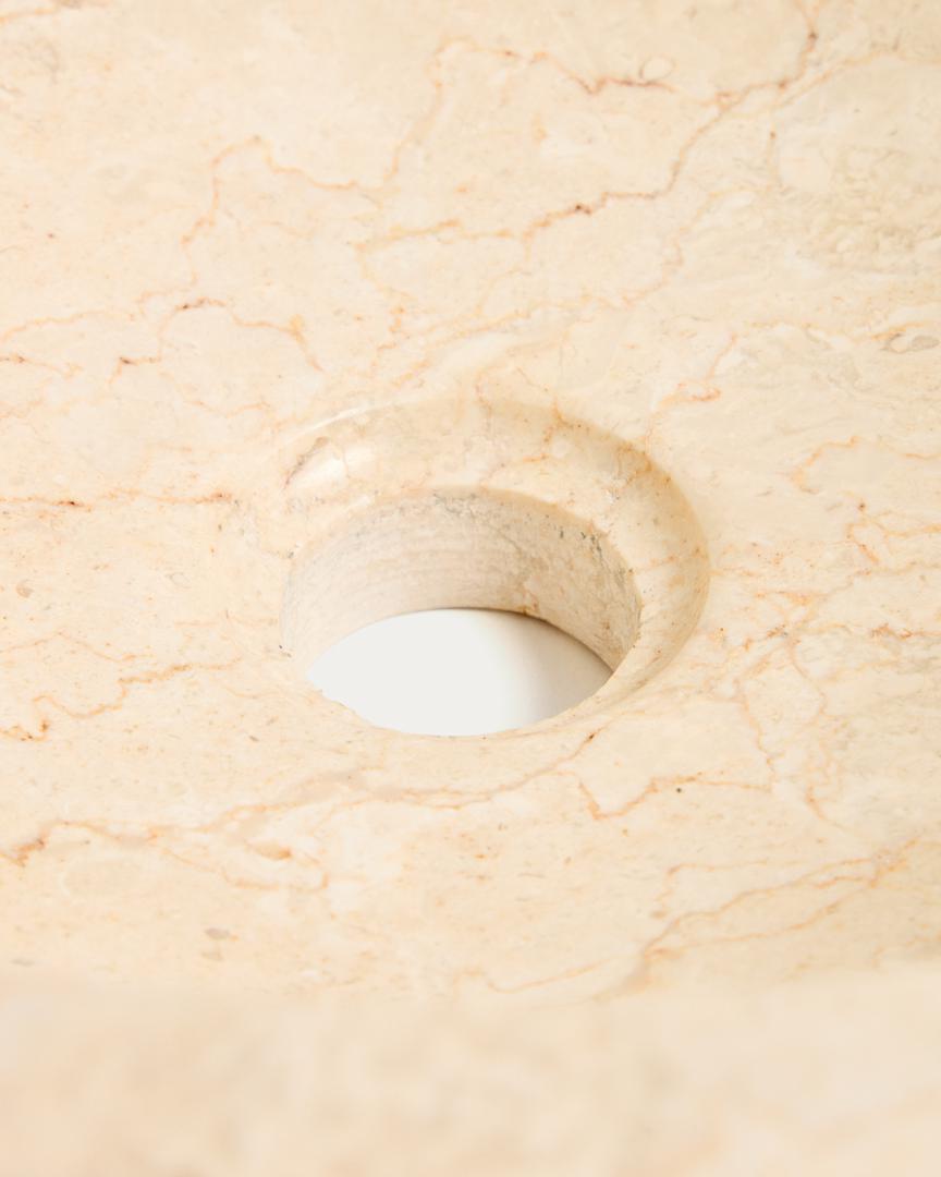 Мраморная столешница для умывальника – уникальное изделие, изготовленное вручную из мрамора, добытого непосредственно на острове Ява. Каждый элемент тщательно обрабатывается традиционными инструментами, что придает ему уникальные зерна и оттенки: эстетическую ценность несовершенства, характерную для этого материала. Полированная внутренняя поверхность усиливает блеск камня. Внешняя поверхность обработана резцом, что придает поверхности текстуру.