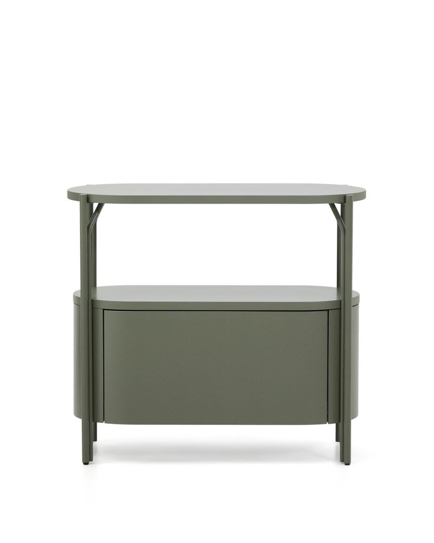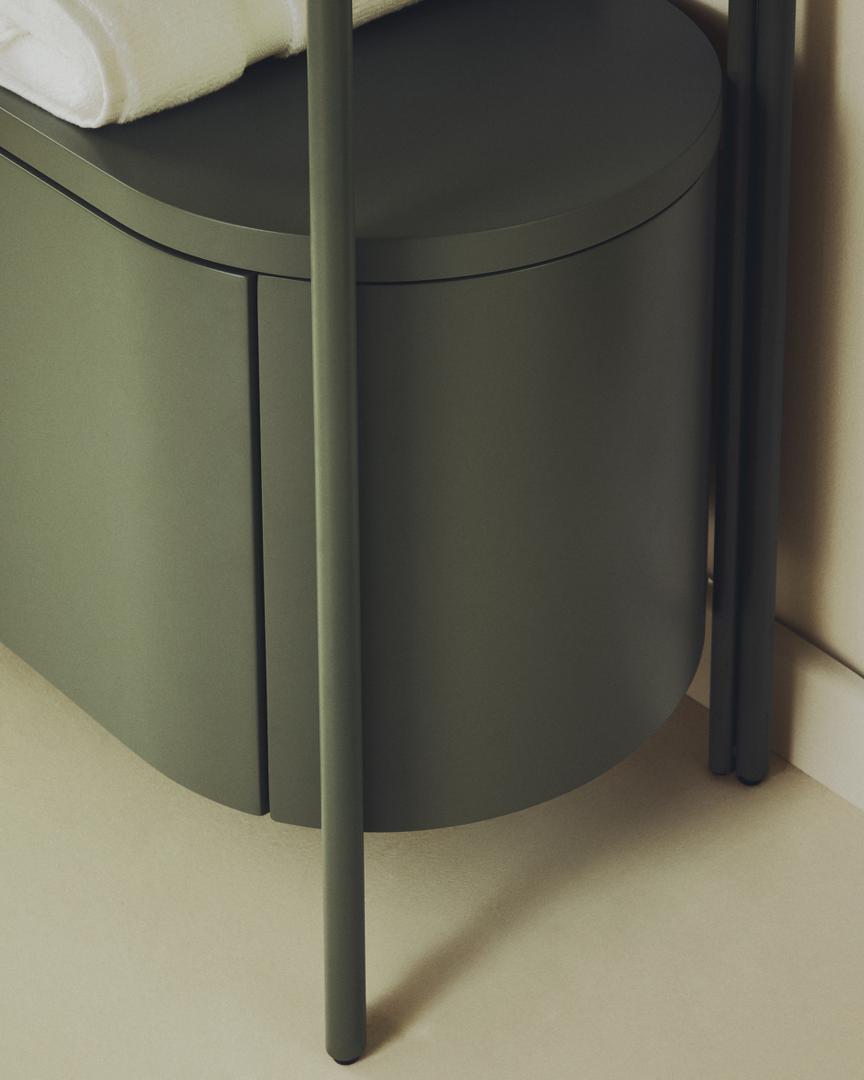 Этот предмет мебели для ванной комнаты сочетает в себе плавные формы и простые объёмы, создавая функциональное и уютное пространство. Эксклюзивный дизайн от Nahtrang для Kave Home исключает острые углы и способствует комфорту, обеспечивая плавное взаимодействие в повседневной жизни. Сочетание стальной конструкции и корпуса из лакированного водоотталкивающего МДФ обеспечивает прочность и устойчивость, а также элегантную отделку, которая гармонирует с любым стилем ванной комнаты. Выдвижной ящик с системой открывания от нажатия и плавного закрывания.