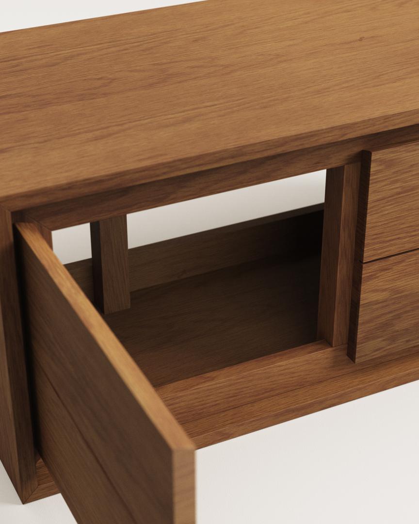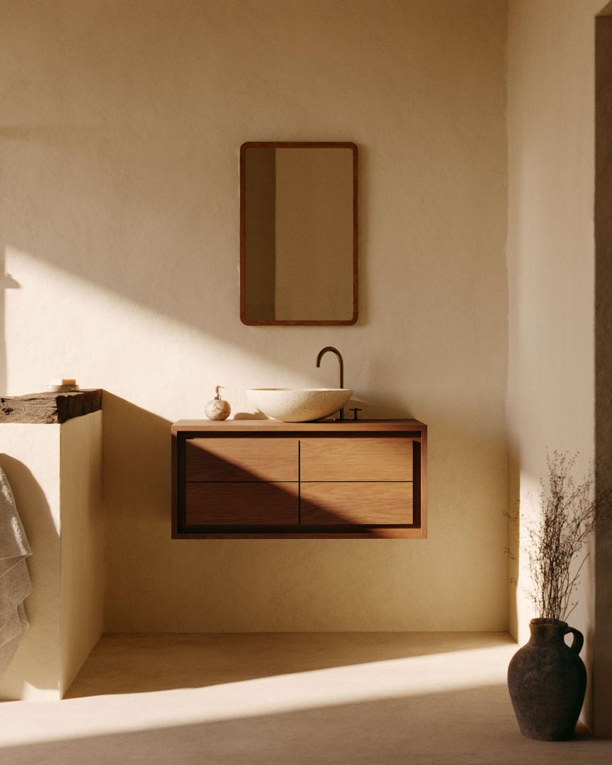 Мебель для ванной комнаты из массива тикового дерева с отделкой под орех и двумя дверцами.