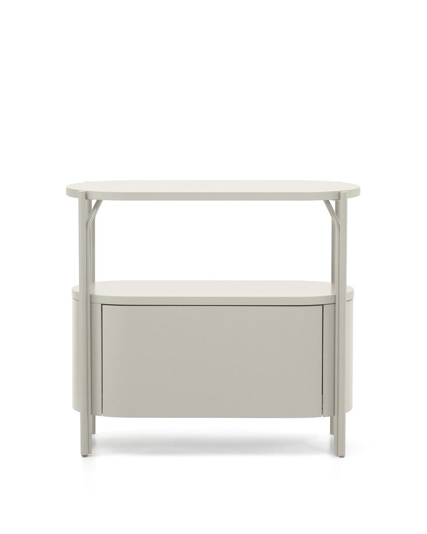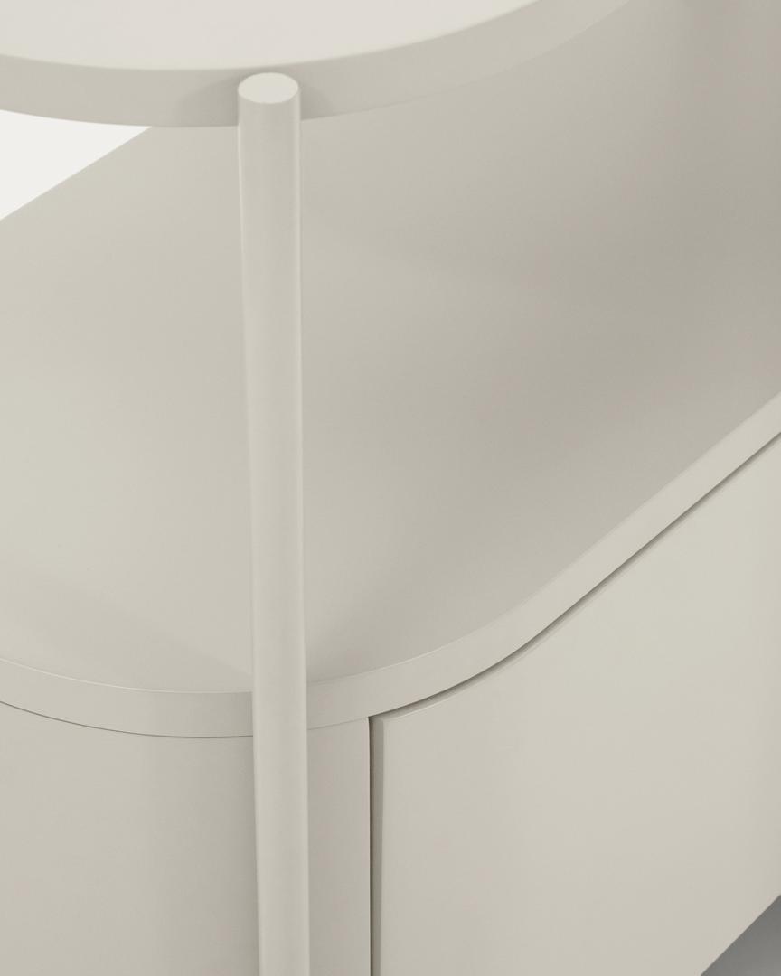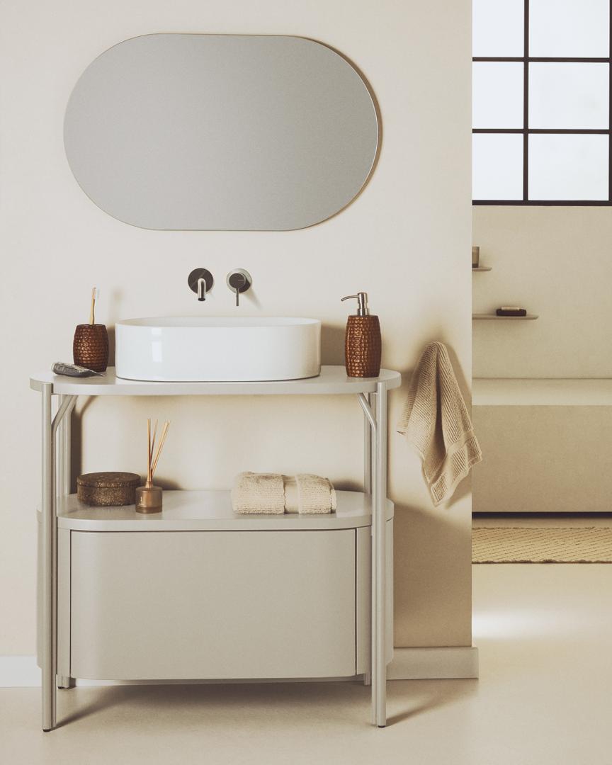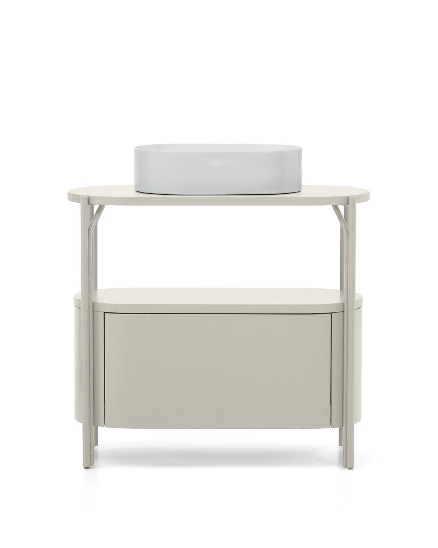Этот предмет мебели для ванной комнаты сочетает в себе плавные формы и простые объёмы, создавая функциональное и уютное пространство. Эксклюзивный дизайн от Nahtrang для Kave Home исключает острые углы и способствует комфорту, обеспечивая плавное взаимодействие в повседневной жизни. Сочетание стальной конструкции и корпуса из лакированного водоотталкивающего МДФ обеспечивает прочность и устойчивость, а также элегантную отделку, которая гармонирует с любым стилем ванной комнаты. Выдвижной ящик с системой открывания от нажатия и плавного закрывания.