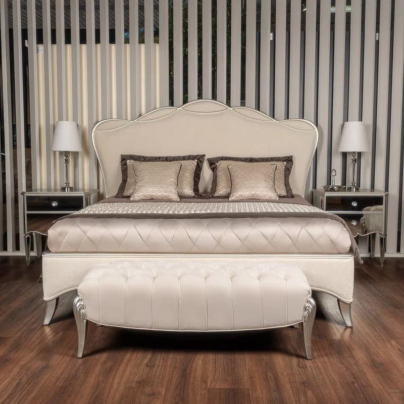 Банкетка на резных ножках выполнена в стиле ар-деко. Сиденье декорировано стежкой капитоне, ножки покрыты серебряным напылением.