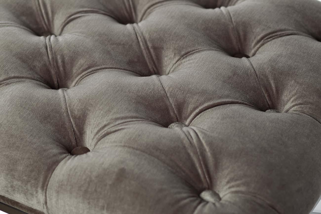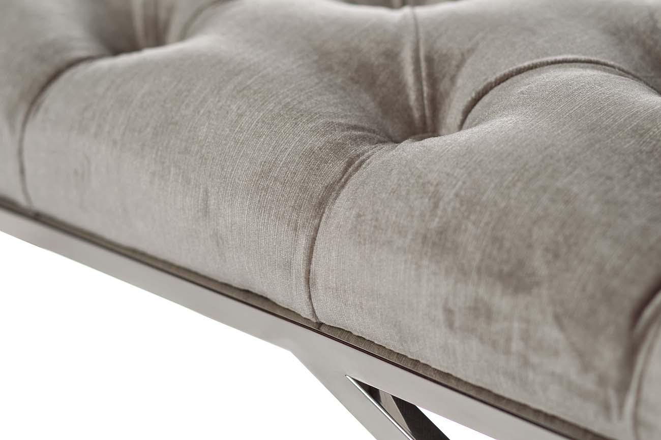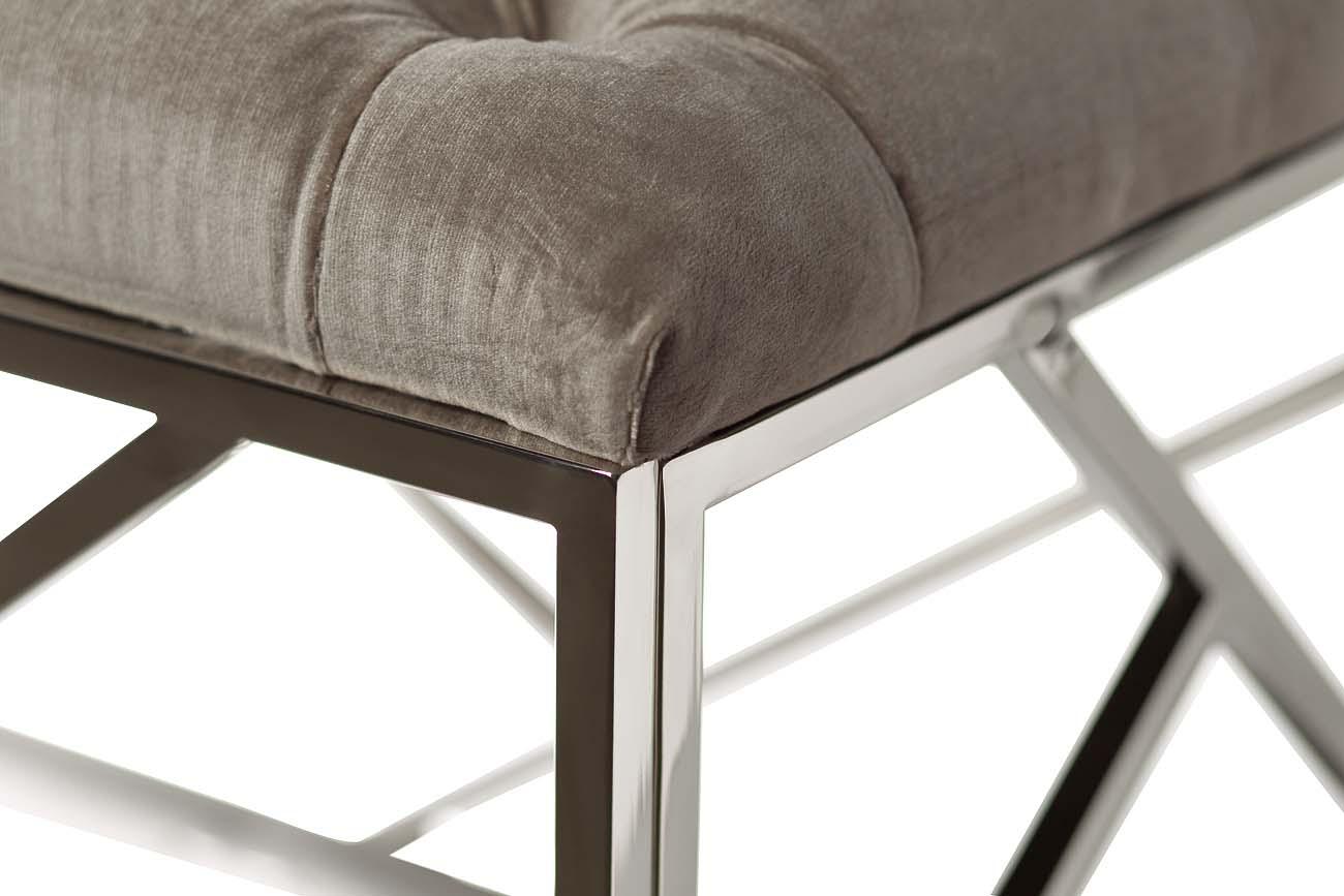 description-full - Красивая стеганая банкетка – роскошь в лучшем проявлении. Каркас из нержавеющей стали оригинальной формы и мягкая обивка из первоклассного велюра делают эту модель настоящим украшением интерьера. Стильная серая банкетка универсальна – она легко сочетается с другой мебелью в стилистике ар-деко, модерн, шебби-шик, фьюжн. Органично вписывается в пространство прихожей, спальни, гардеробной. Особой изящности модели придает устойчивая опора из стали с благородным блеском. На сайте Garda Decor вы можете купить банкетку в спальню или прихожую в современной стилистике.