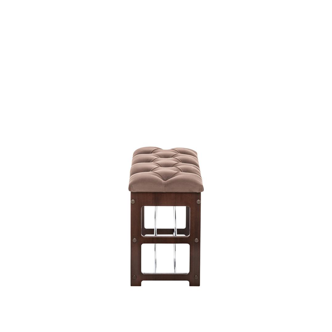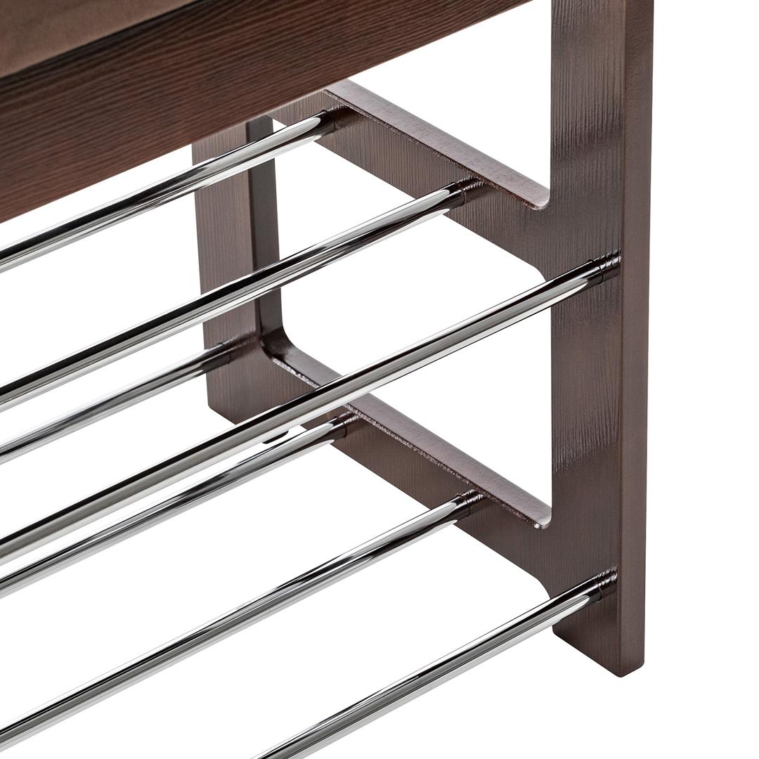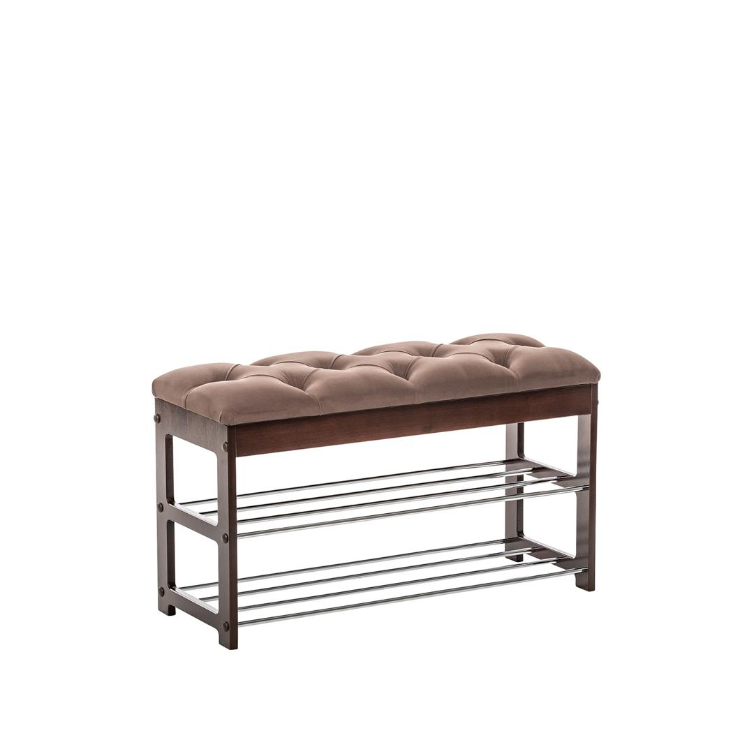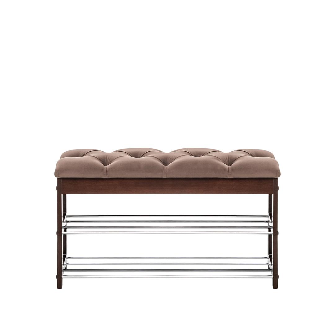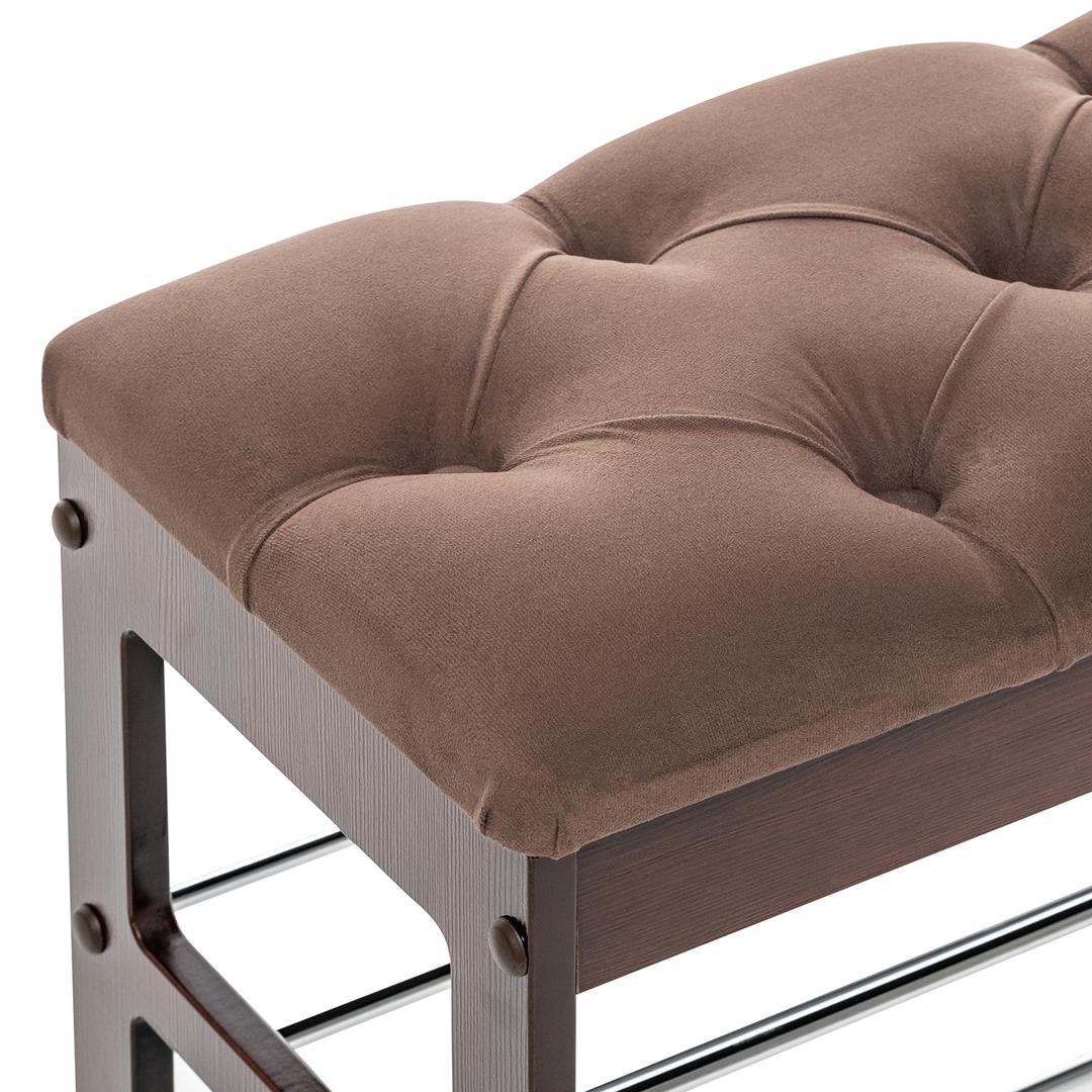 Широкая двухместная банкетка с мягким сиденьем и полкой для обуви. Она сделана в незамысловатом дизайне и органично впишется в любой интерьер.