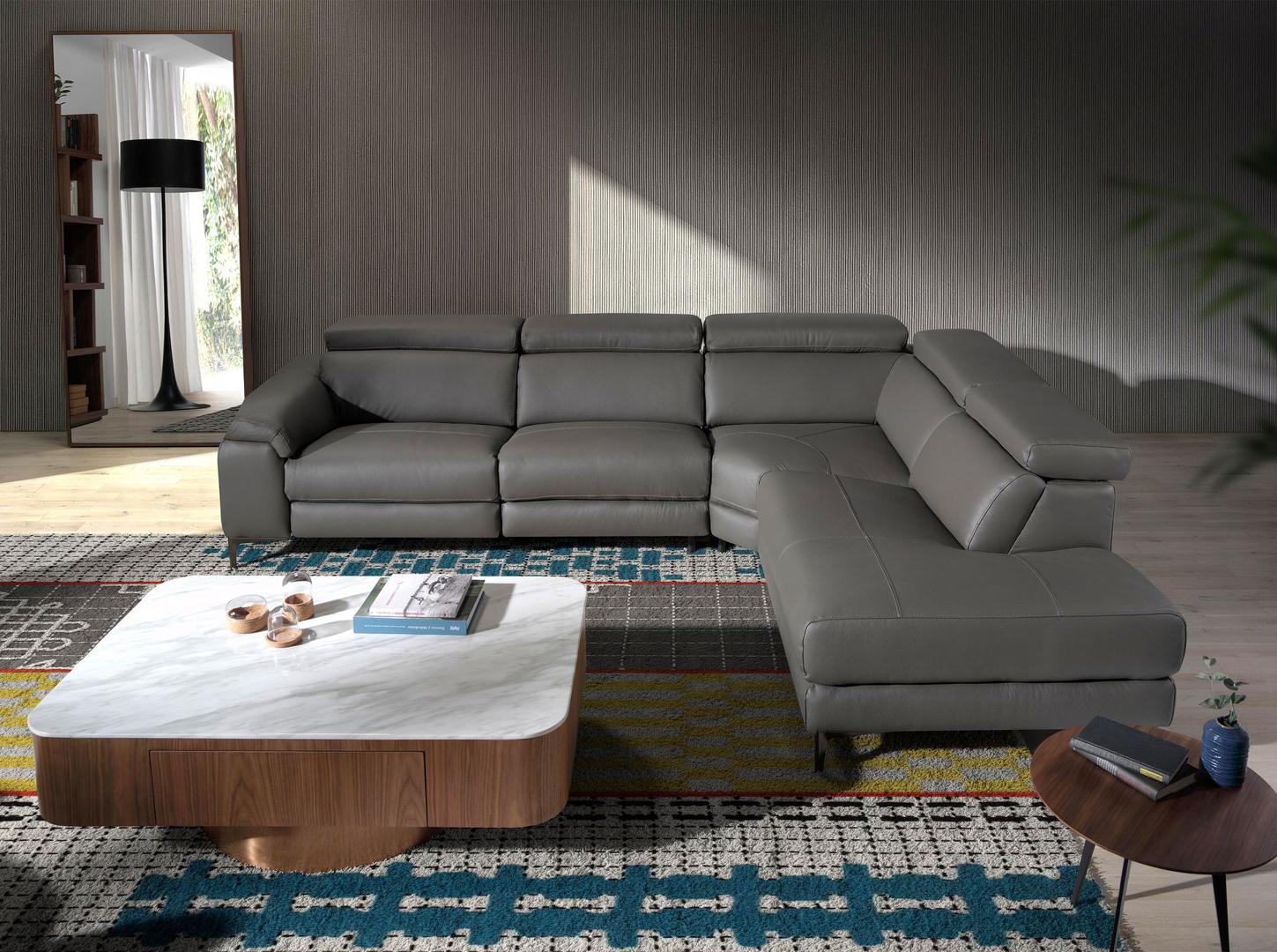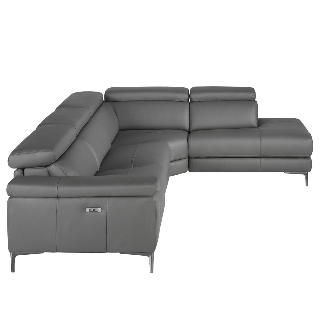 Угловой диван (R), обитый коровьей кожей серого цвета, с черными стальными ножками, окрашенными эпоксидной смолой, и независимыми регулируемыми подголовниками. Боковое сиденье с электрическим механизмом релаксации.