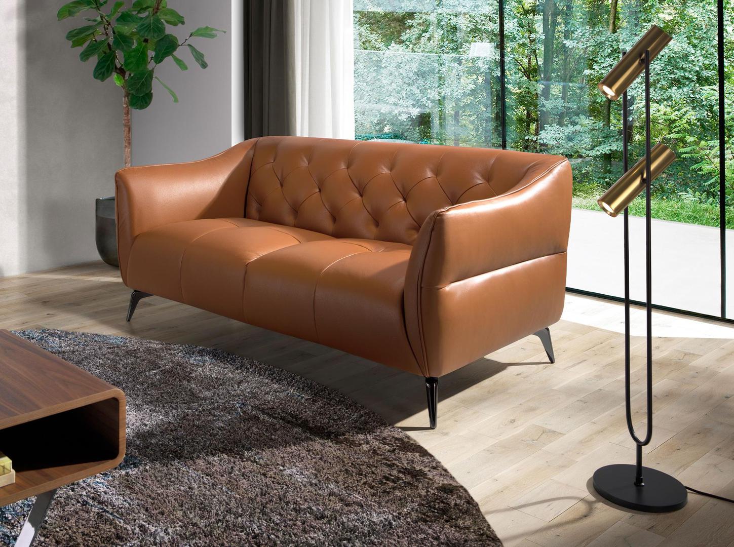 2-местный диван с обивкой из воловьей кожи со стеганой спинкой. Внутренняя структура из натуральной сосны и ножки из массивной затемненной нержавеющей стали. Кожа - Marrón Caramelo M5676.