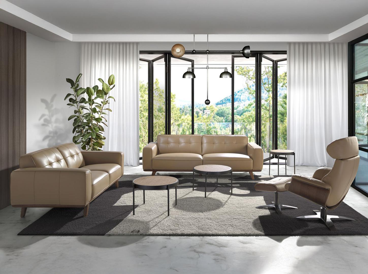 2-местный диван с обивкой из воловьей кожи песочного цвета. Внутренняя структура из натуральной древесины сосны и структура ножек из дерева орехового цвета. Кожа - Arena M5668.