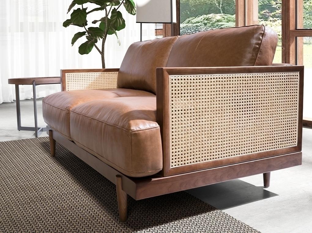 2-местный диван современного дизайна, обитый коричневой яловой кожей . Благодаря своему стилю и деревянным ножкам цвета ореха этот диван привнесет нотку авангарда и элегантности, которую вы ищете в своем доме. Модный диван, идеально подходящий для вашей зоны отдыха, с оригинальной деталью из ротанга . Кожа - M2731.
