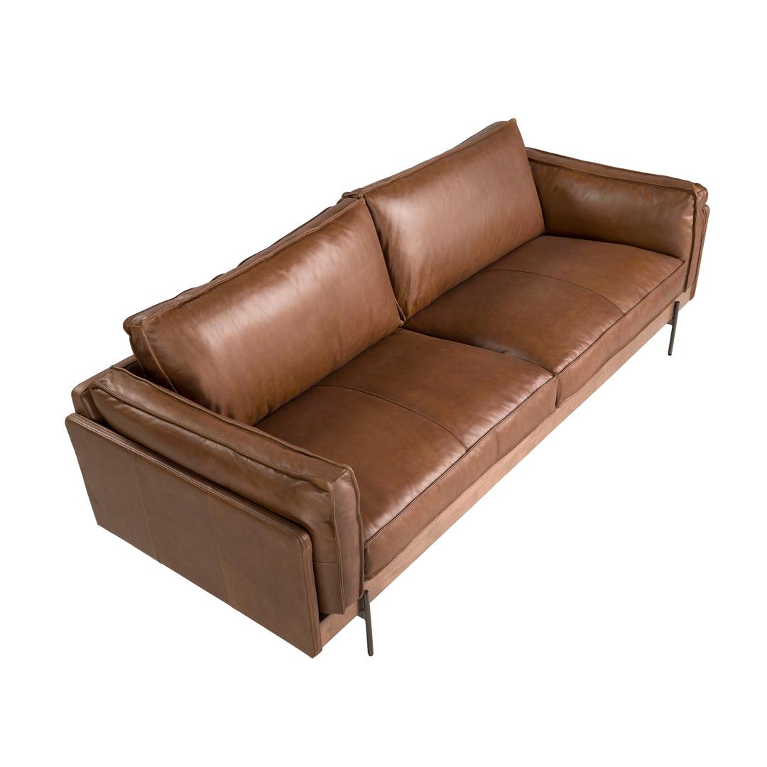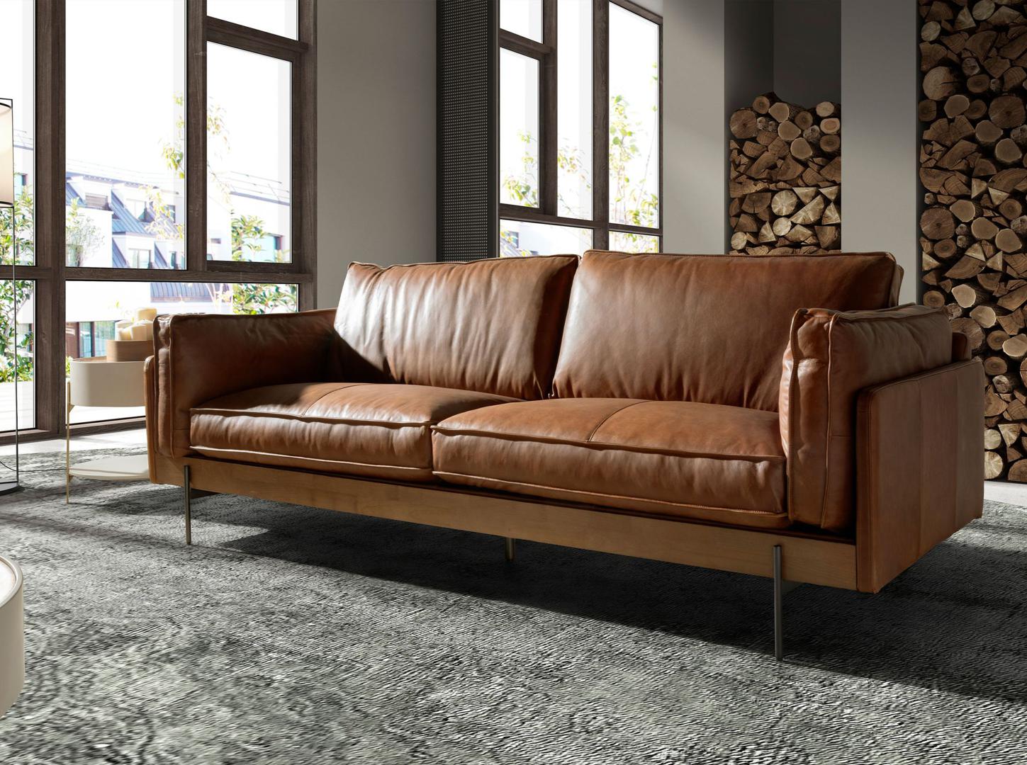 Современный 3-местный диван, обитый воловьей кожей табачно-коричневого цвета. Благодаря своему стилю, отделке из пропаренного бука цвета ореха и ножкам из темной нержавеющей стали этот диван привнесет в ваш дом нотку авангарда и элегантности, которую вы ищете.