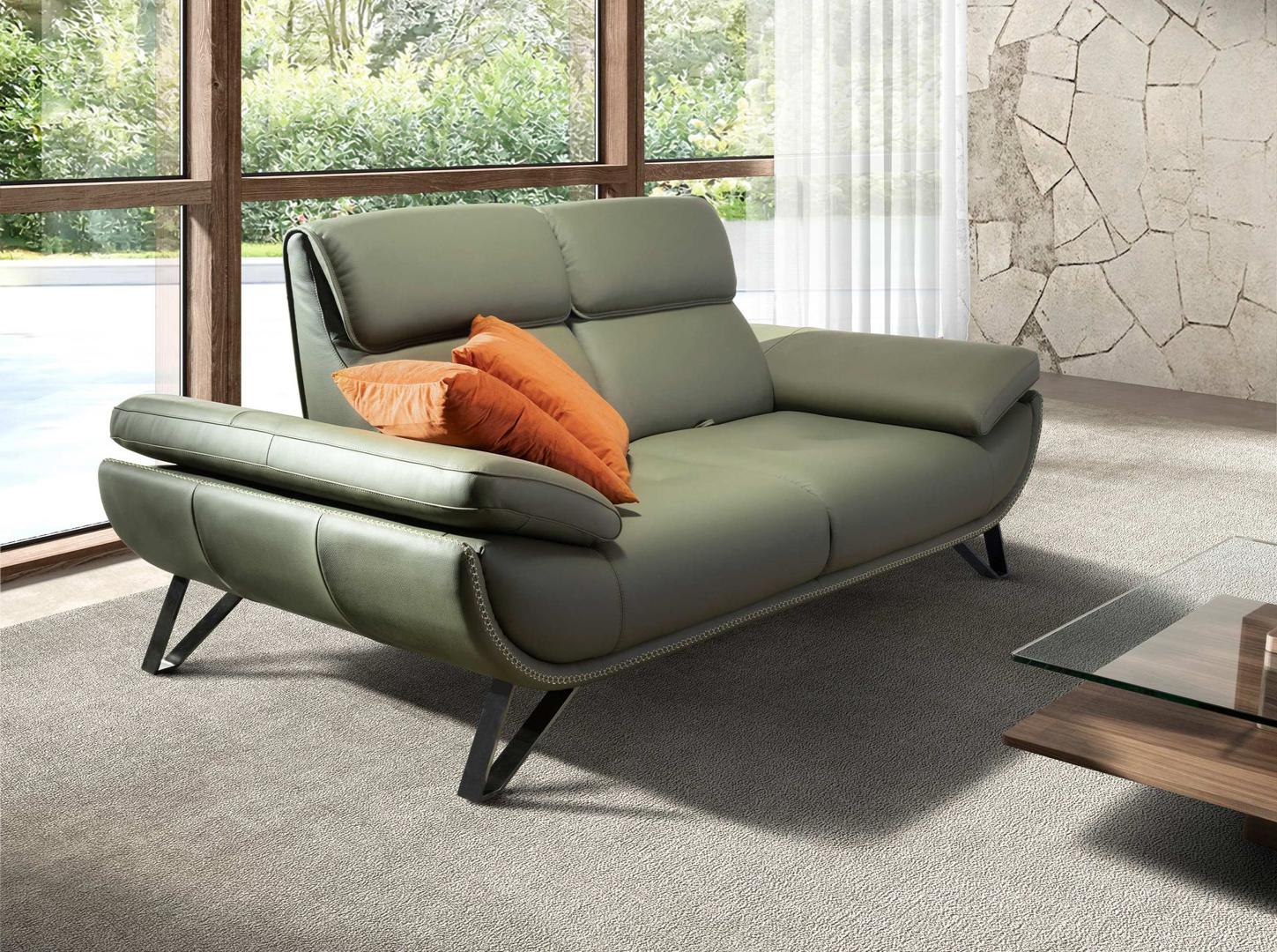 2-местный диван современного дизайна, обитый оливково-зеленой воловьей кожей. Благодаря своему стилю и ножкам из темной хромированной нержавеющей стали этот диван привнесет нотку авангарда и элегантности, которую вы ищете для своего дома.