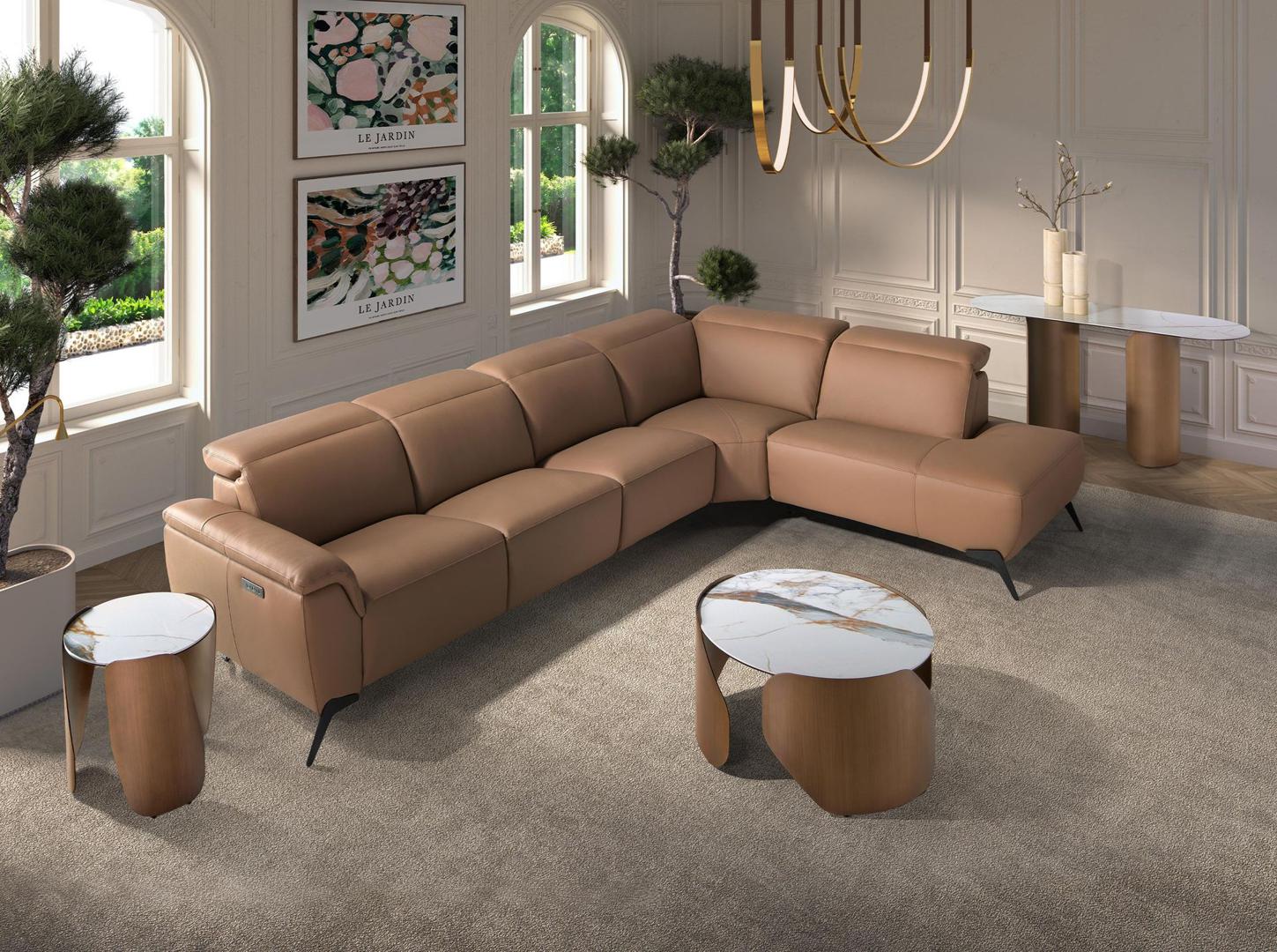 Пятиместный модульный диван-шезлонг с электроприводом и регулировкой наклона спинки, современный дизайн, обивка из натуральной коричневой коровьей кожи, подголовники для большего комфорта. Его стиль и черные ножки из нержавеющей стали придадут вашему дому нотку авангардного дизайна и элегантности, которую вы ищете. Электрическая система релаксации обеспечит дополнительный комфорт, необходимый для отдыха.