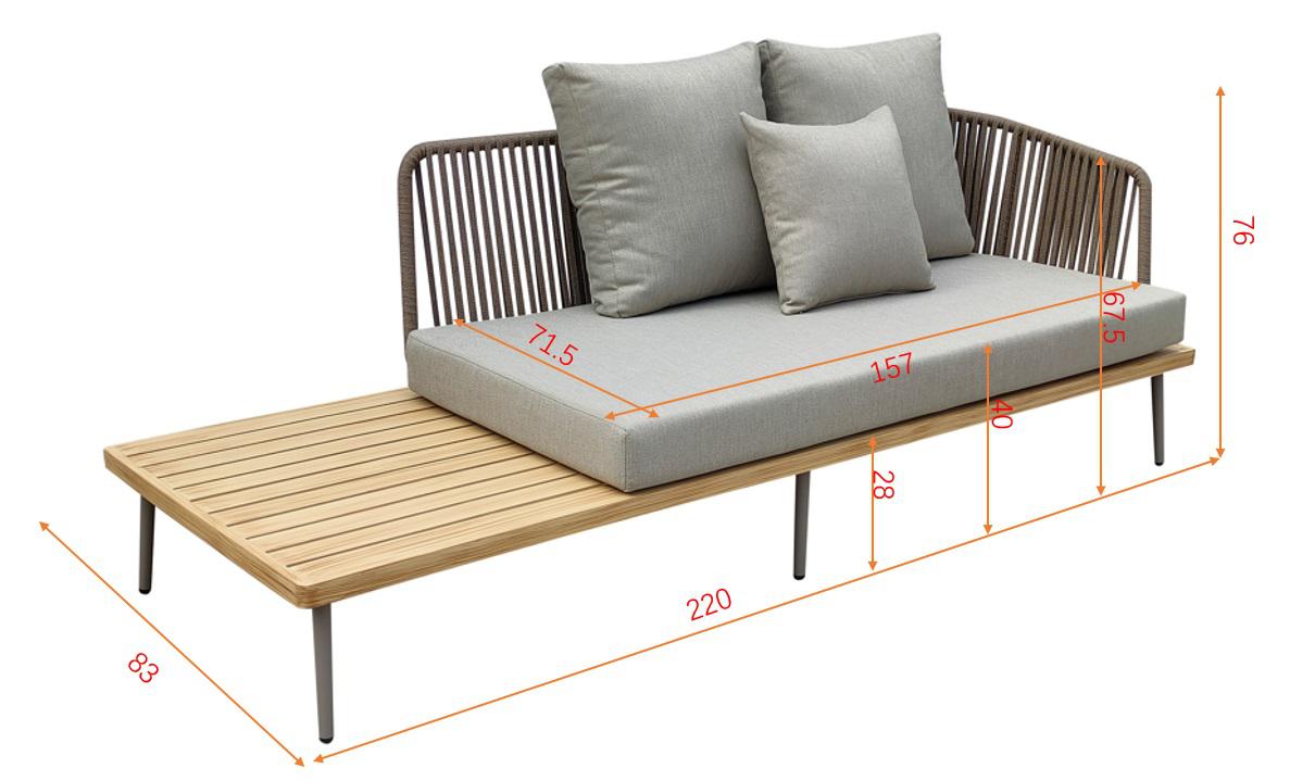 description-full - Уличный диван изготовлен из устойчивых к погодным условиям материалов. Cъемные подушки выполнены из специальной уличной ткани с водоотталкивающими свойствами OLEFIN тайваньского производства. Светлая ткань не будет сильно нагреваться на солнце и выцветать. Каркас из алюминия декорирован в цвет дерева, подлокотники и спинка оплетены декоративным шнуром. Особенность дивана в том, что сиденье не полностью закрывает основание, есть возможность сервировать закуски и напитки, либо положить полотенце и принадлежности для купания. Эта модель выпускается в правом и левом исполнении. В комплект входит подушка сиденья 12см, 2 подушки спинки и 1 декоративная квадратная подушка. Габариты сиденья: ширина 157см, глубина 71,5см, высота от пола 40 см, высота подлокотника от сиденья 27см. Сочетается с уличным креслом 129KN-03041, диванами 129KN-03042, 129KN-03047 и кофейными столиками 129KN-01430, 129KN-00620.