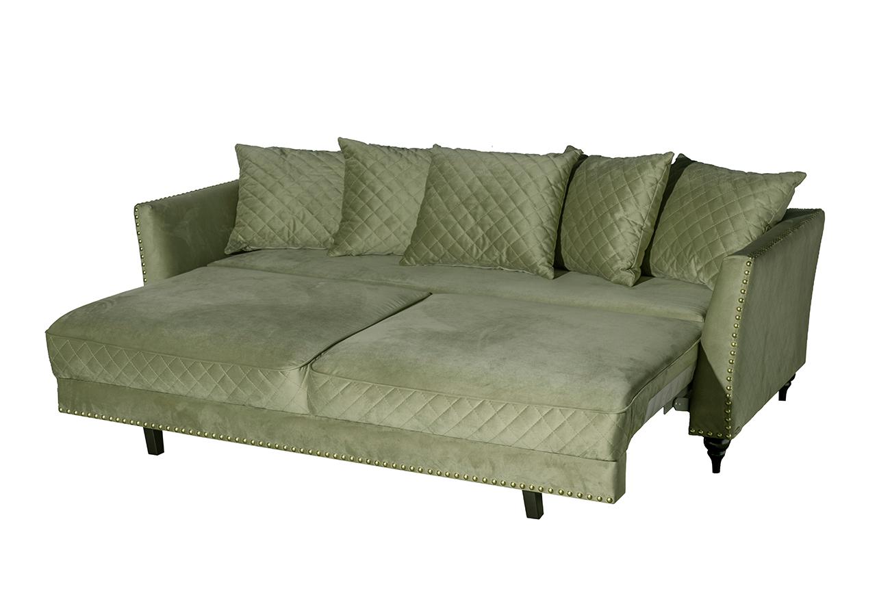 description-full - Стильный раскладной диван для гостиной Сорренто(Sorrento) воплощает в себе аристократическую элегантность и максимальный комфорт. Мягкая спинка с подлокотниками и декоративные подушки делают отдых уютным и красивым. За счет надежной системы трансформации «пума», трехместный диван легко становится удобным спальным местом для двоих человек и гарантирует здоровый сон. Собственное мебельное производство Garda Decor позволяет купить диван в Москве с изменениями в дизайне. Каркас дивана выполнен из калиброванного деревянного бруса 1 категории; в основании дивана - высококачественная фанера из натуральной березы и эластичные ремни. Механизм трансформации - Пума. Высота спинки (габаритная с подушками) - 86см. Ширина подлокотника 15см. В комплекте - 5 подушек спинки 57*65см. В стандартном исполнении: обивка в ткани из коллекции Garda Decor- велюр Colt1002-OLIV, цвет ножек - 4, колесная опора - нет, гвозди большие, цвет золото.