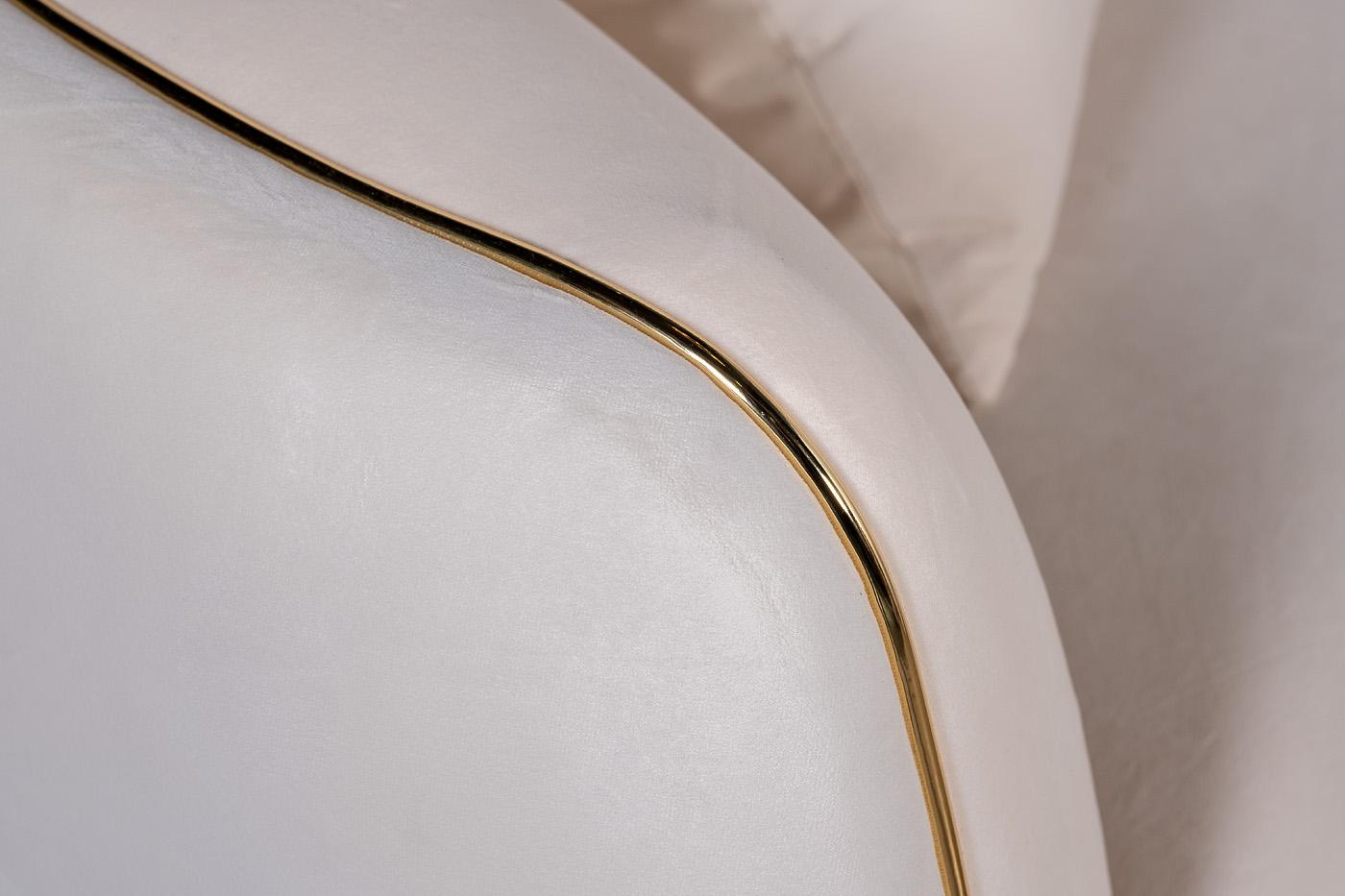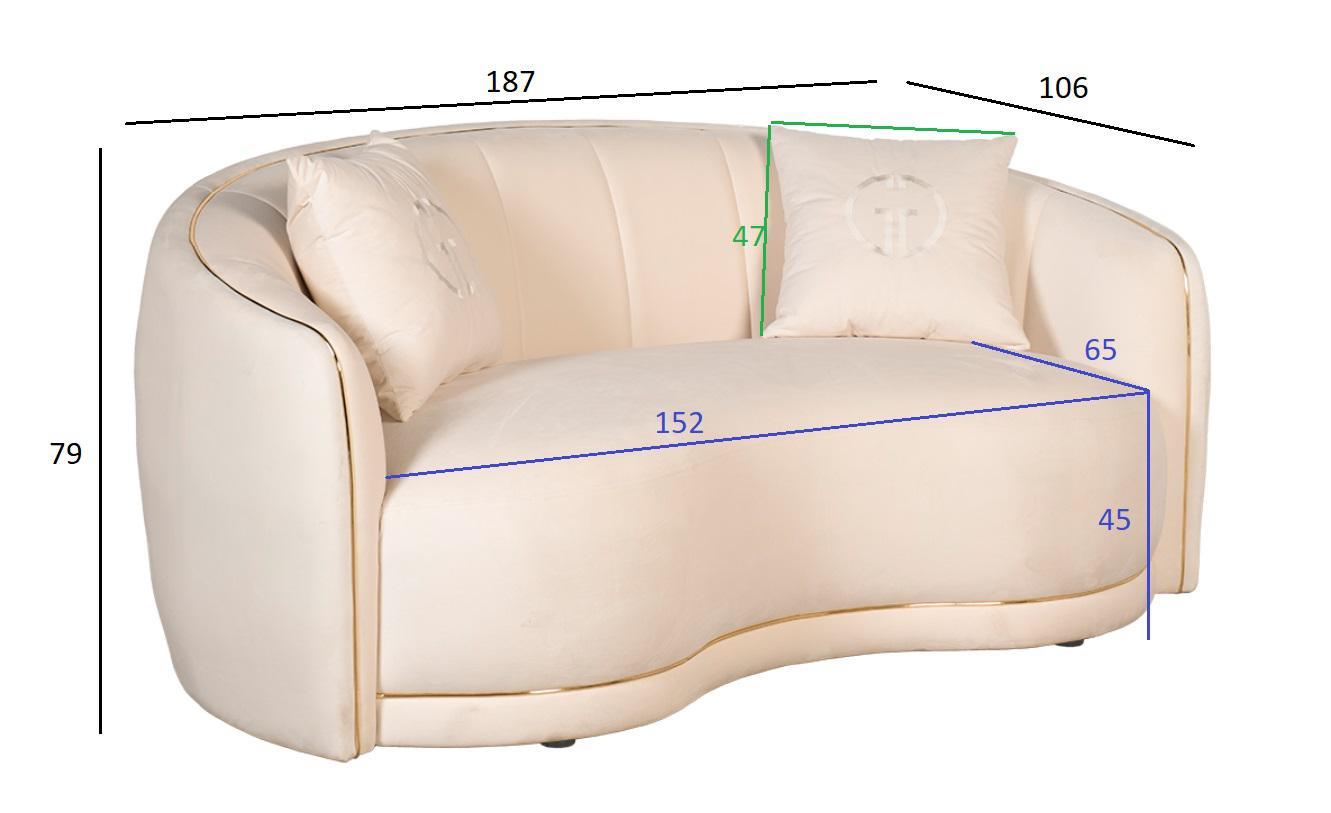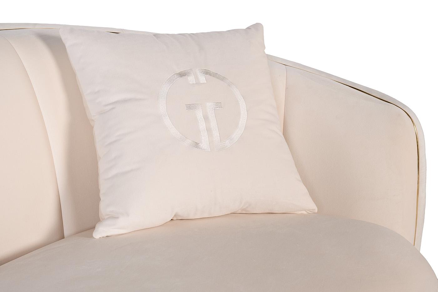 Велюровый диван с плавными формами приятного кремово-бежевого тона - настоящая жемчужина. Золотая окантовка придает ему изысканный и законченный вид. В комплект входят две декоративные подушки 47*47см с вышивкой эмблема в цвет ткани. Габариты сиденья: ши...