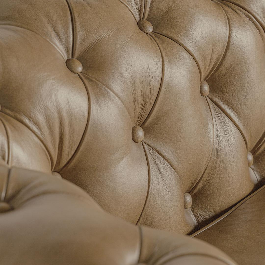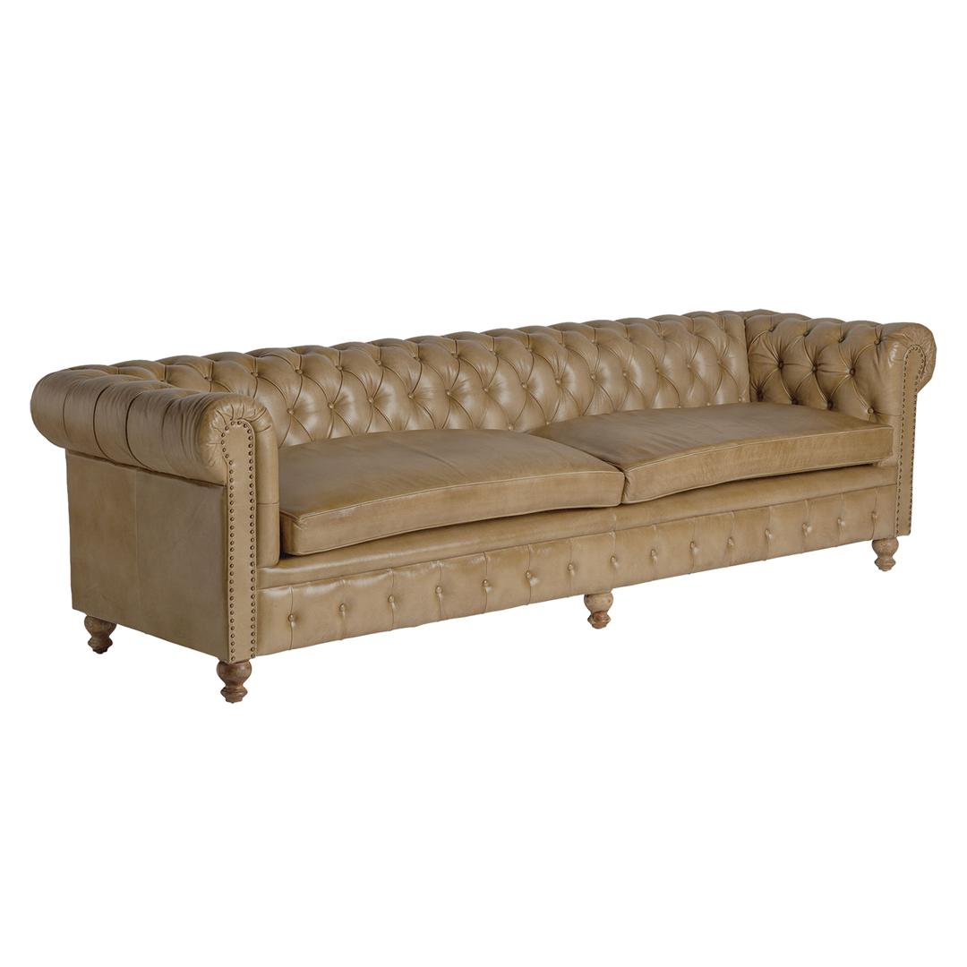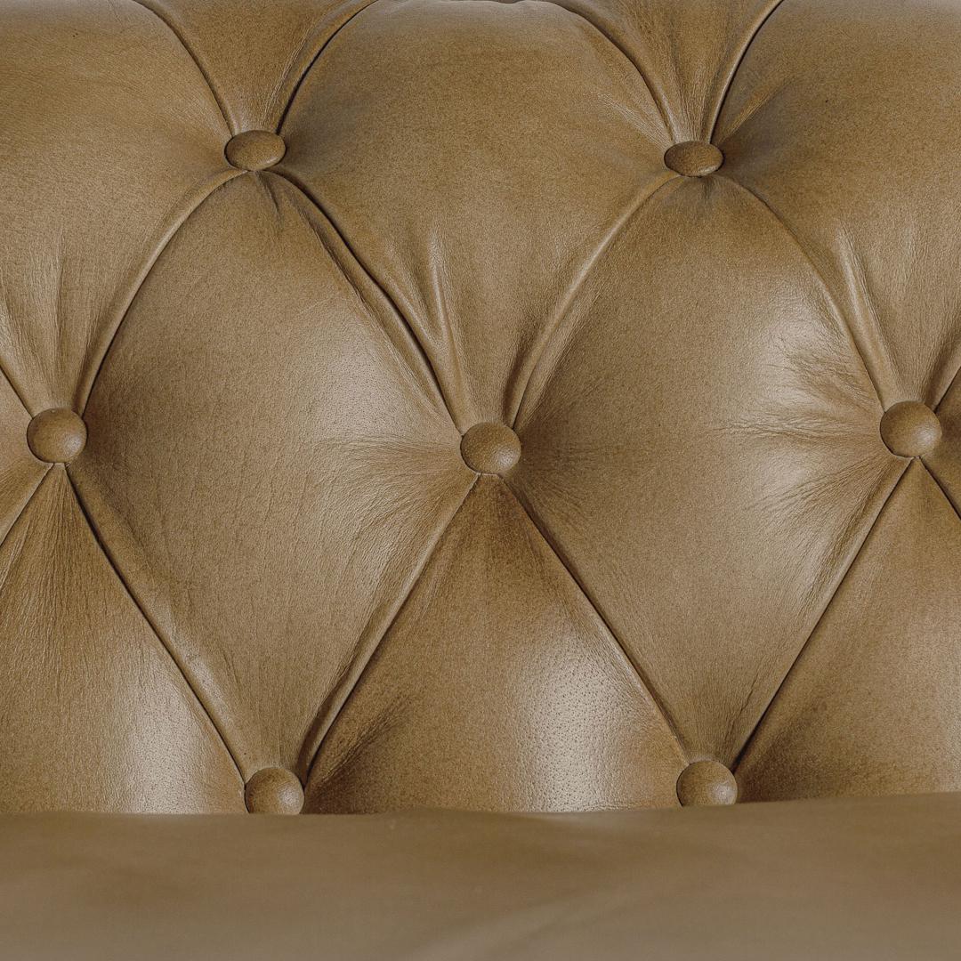 Диван Elkins на пуговицах, коричневый цвет, винтажный стиль. Изготовлен из кожи в сочетании с древесиной сосны.