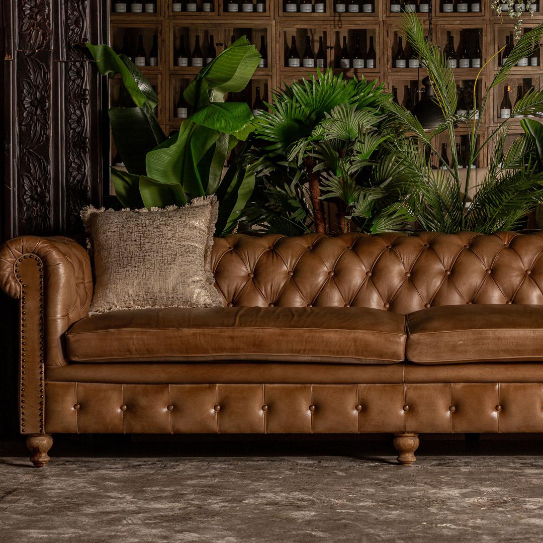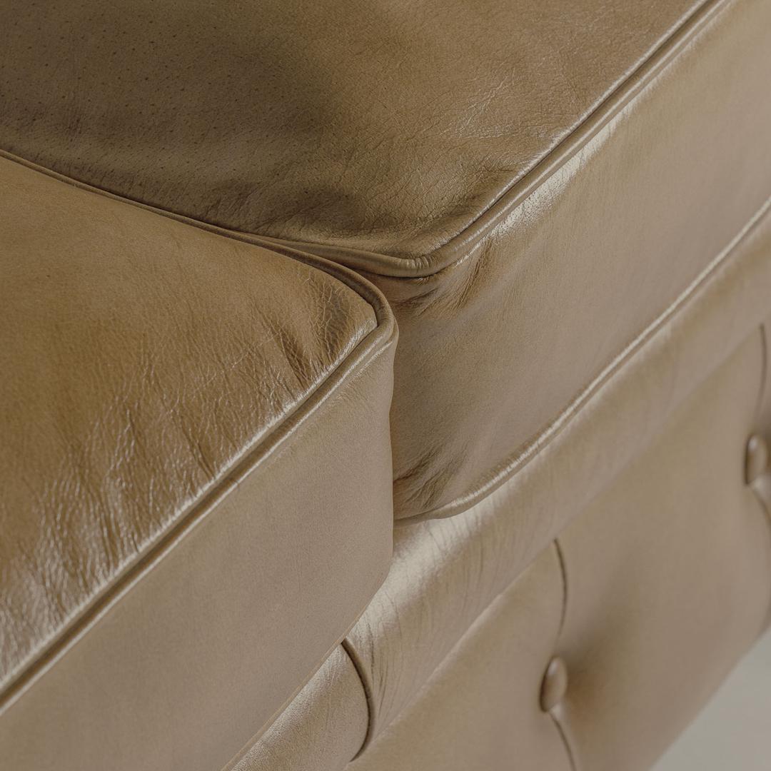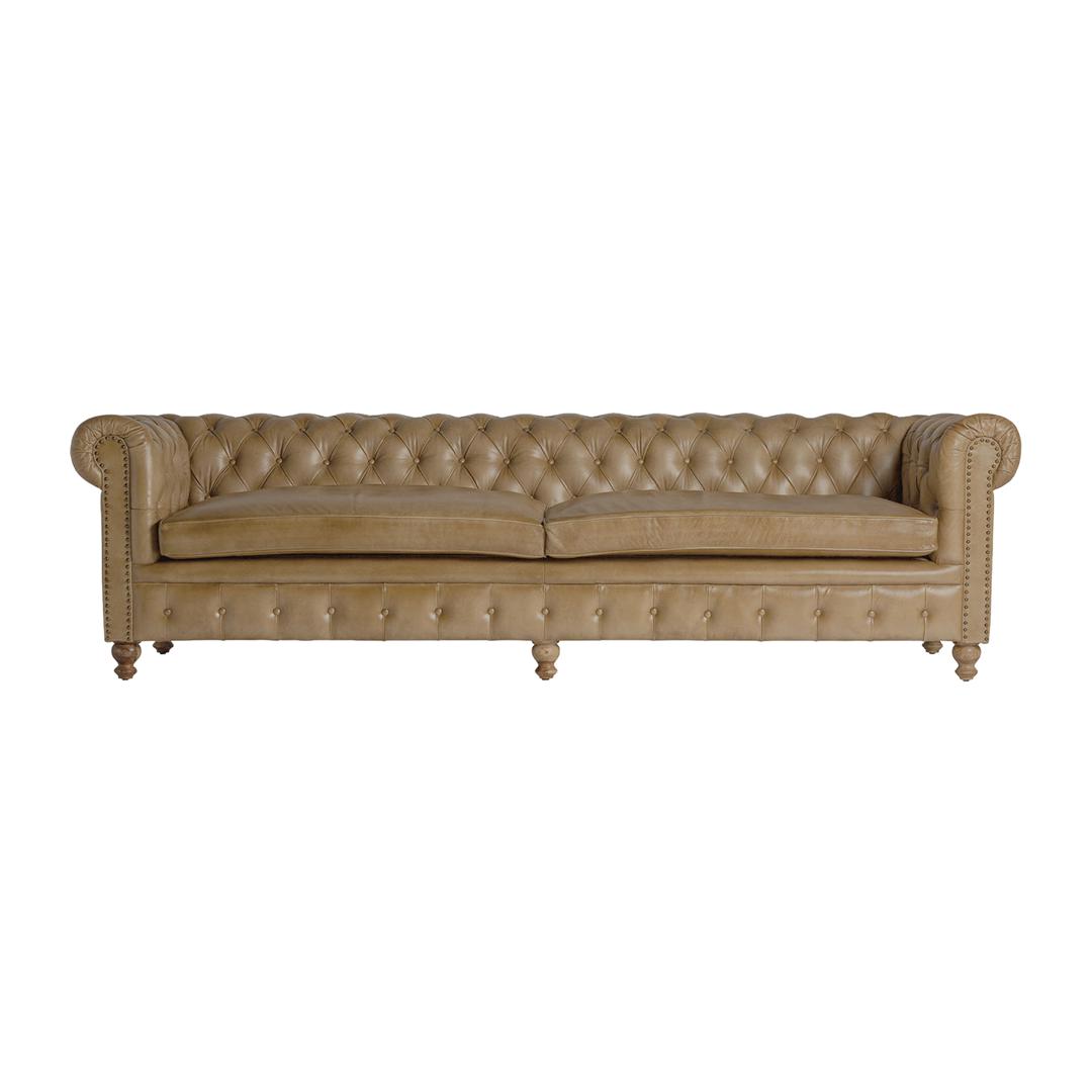 Диван Elkins на пуговицах, коричневый цвет, винтажный стиль. Изготовлен из кожи в сочетании с древесиной сосны.