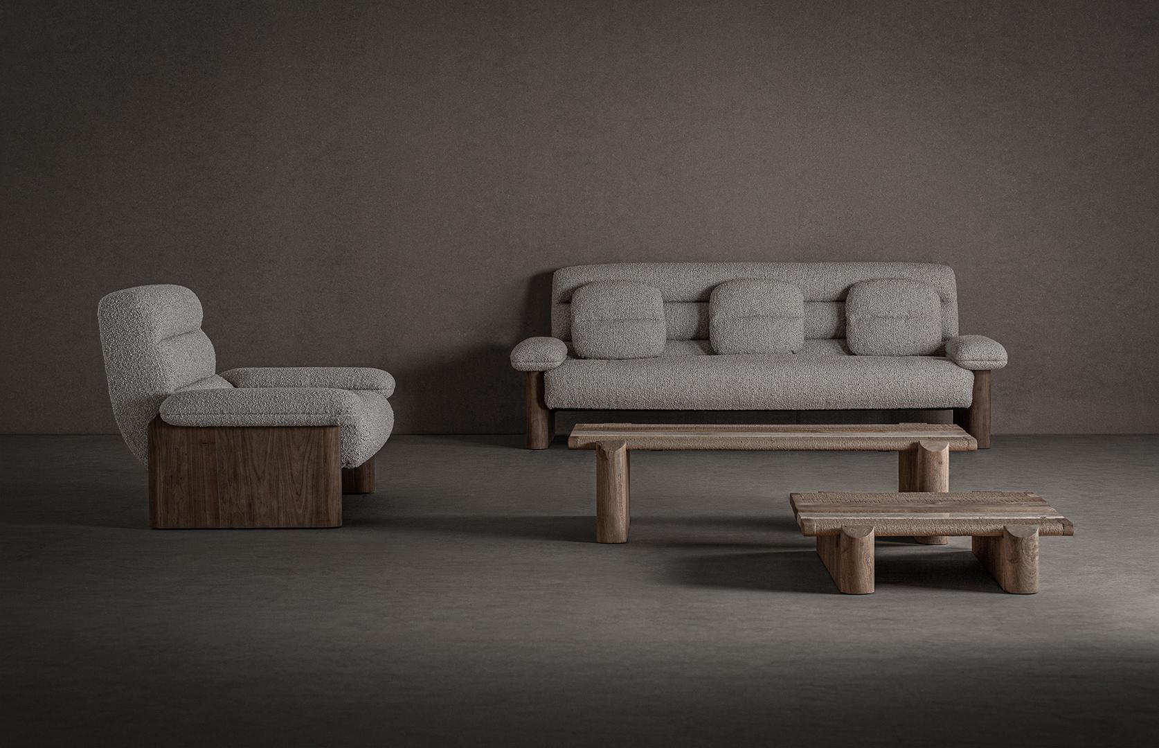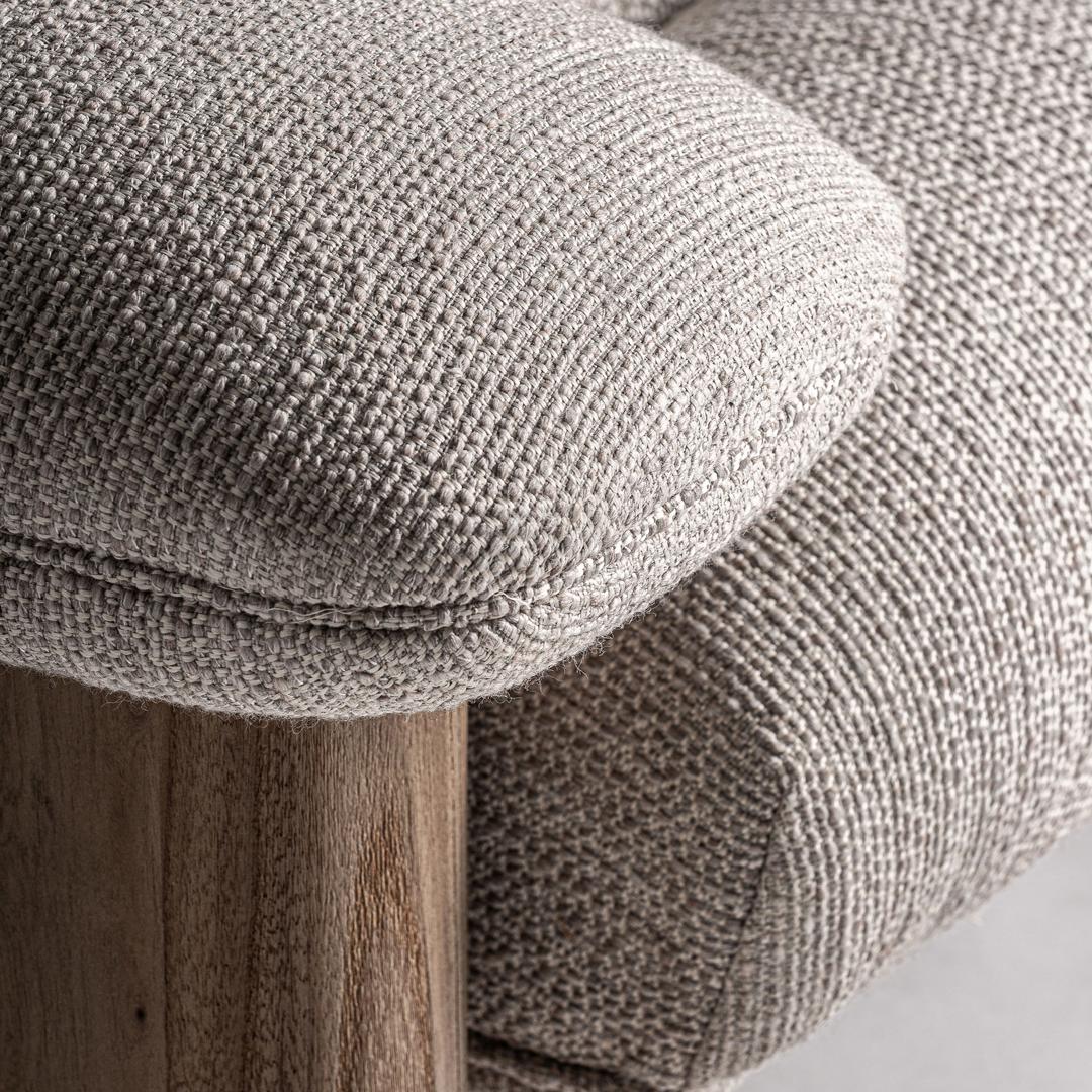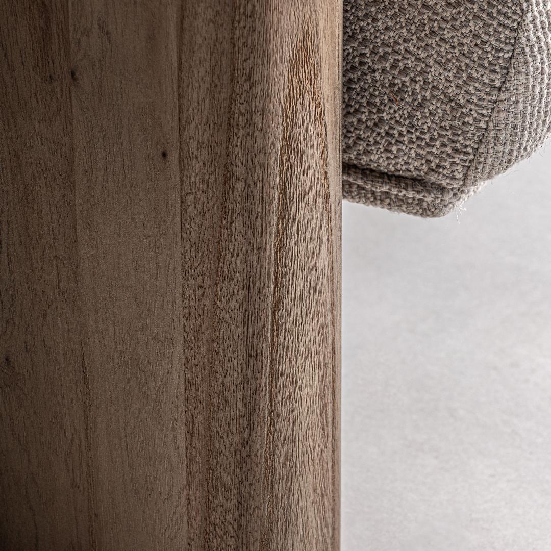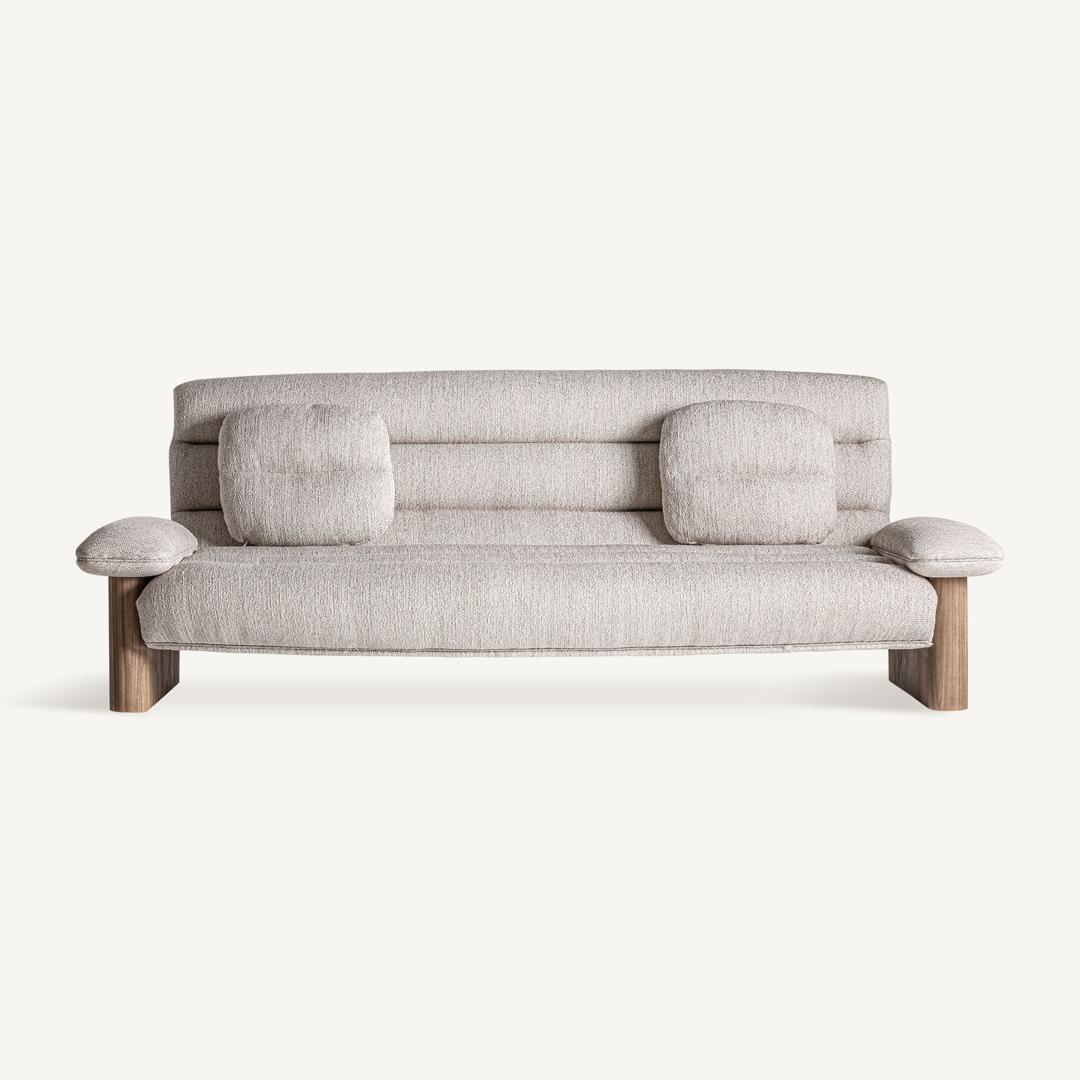 Современный диван. Изготовлен из коричневого дуба в сочетании с бежевым полиэстером.