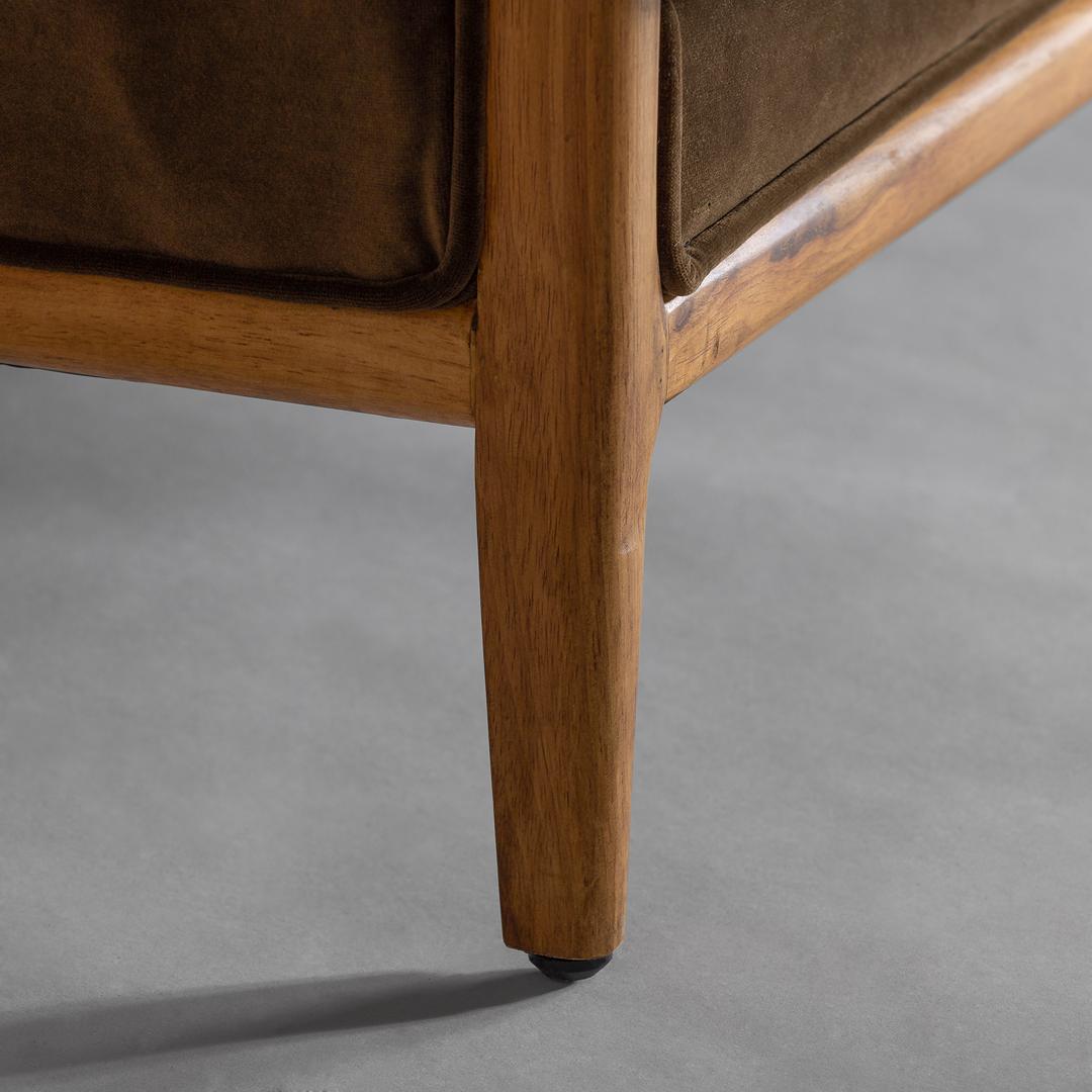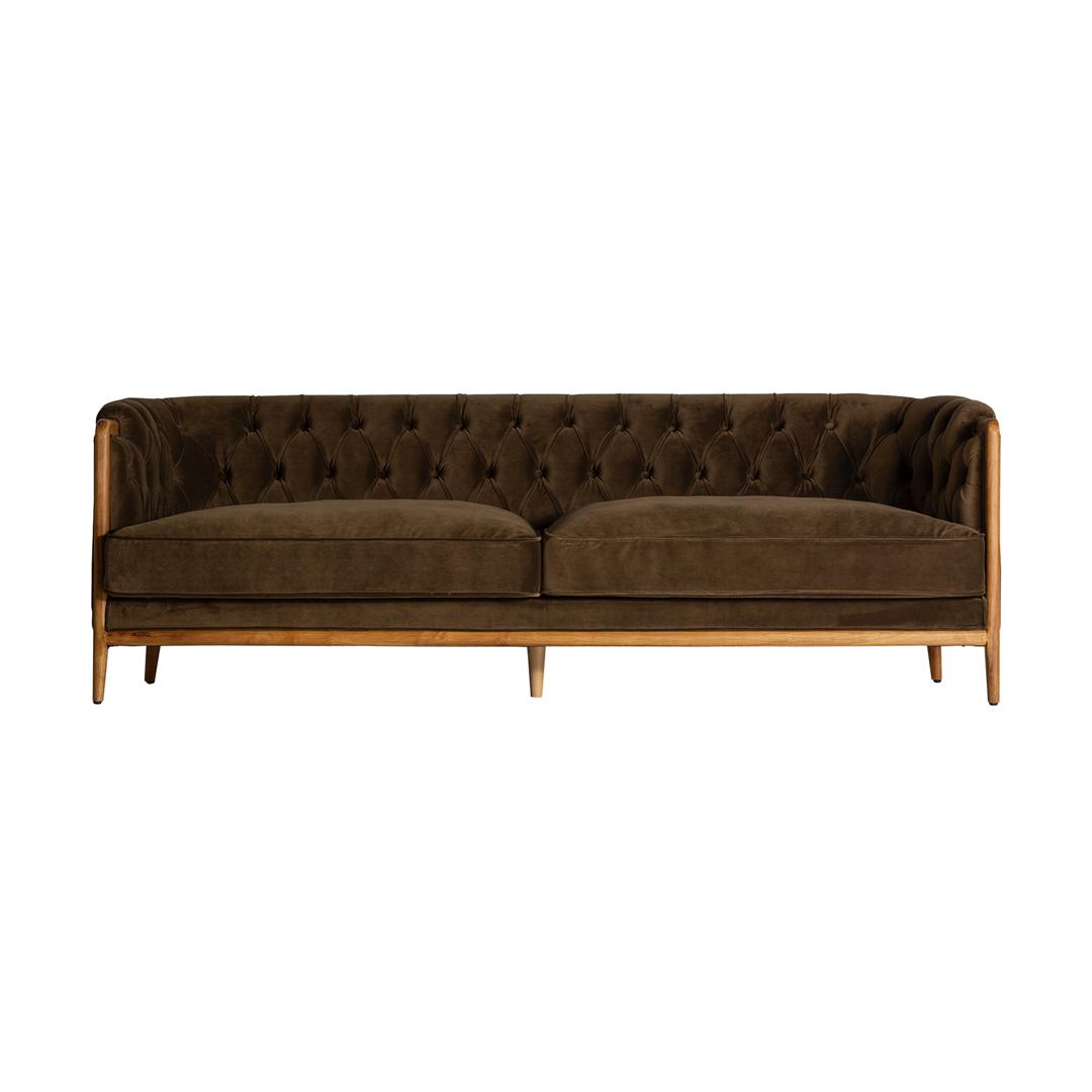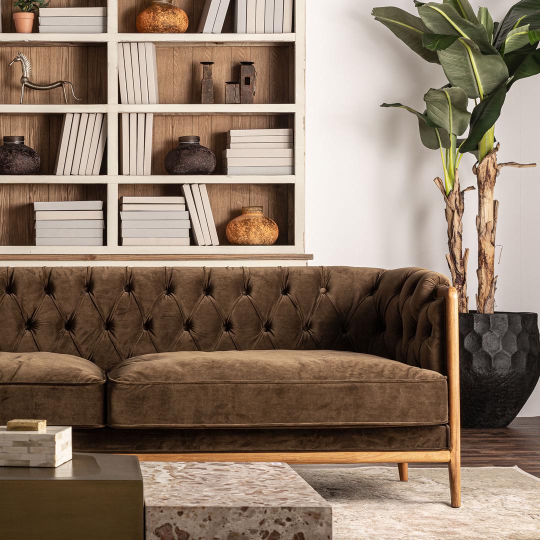 Диван на пуговицах VELBURG, зеленого цвета, колониальный стиль. Изготовлен из акрила в сочетании с каучуковым деревом. Изделие съемное. Ширина: 228 см, Глубина: 88 см, Высота: 78 см