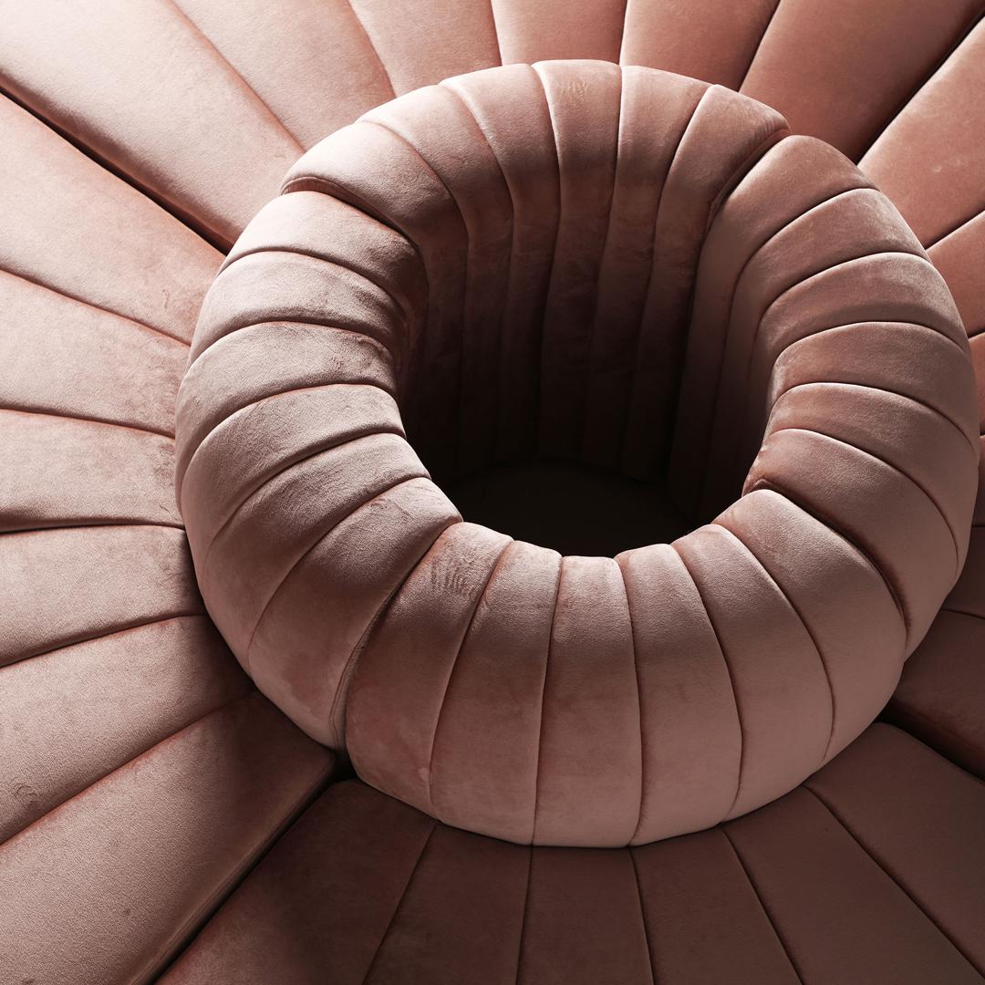 Комфорт и плавные линии. Этот центральный диван в стиле ар-деко изготовлен из сосны и нежно-розового бархата и идеально подходит для создания уютных и неповторимых композиций. Ширина: 150 см, Глубина: 90 см, Высота: 70 см