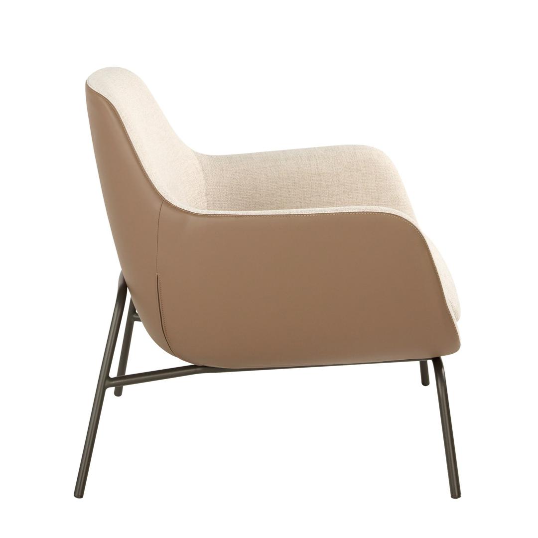 Кресло обито кремовой тканью. Спинка обтянута коричневой экокожей. Черная конструкция ножек из нержавеющей стали. Ткань/Экокожа - TS-E.Beige02 - TS-E.Marrón03.