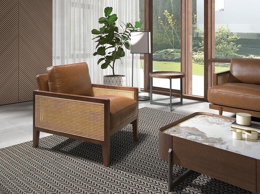 Кресло с подлокотниками современного дизайна, сиденье и спинка обиты коричневой яловой кожей. Благодаря деталям из ротанга и деревянным ножкам орехового цвета это кресло представляет собой идеальное сочетание дизайна и комфорта. Кожа - M2731.