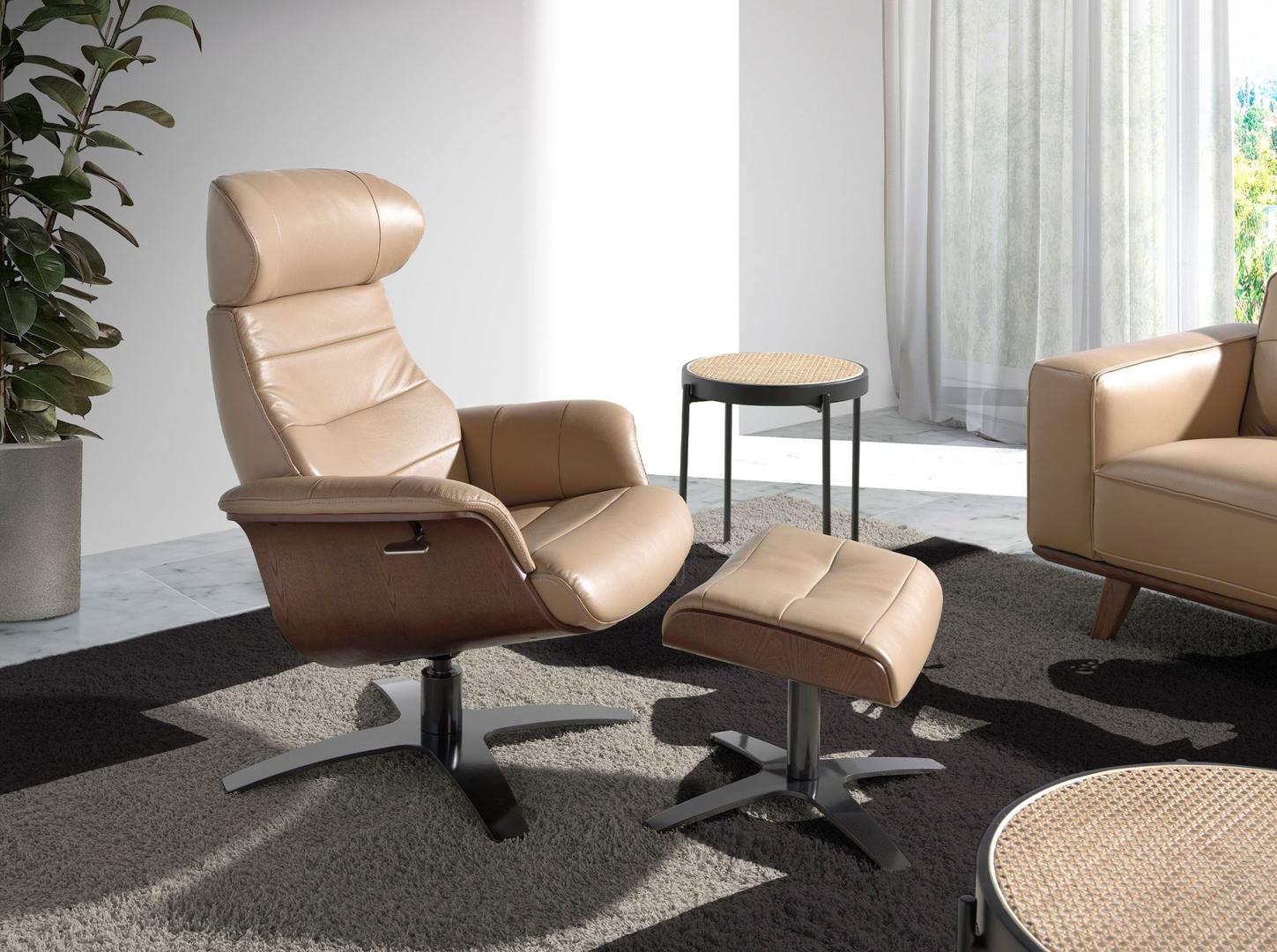 Вращающееся кресло Relax с обивкой из воловьей кожи и основанием из затемненной стали антрацитово-серого цвета. Несущая конструкция из шпона орехового дерева.