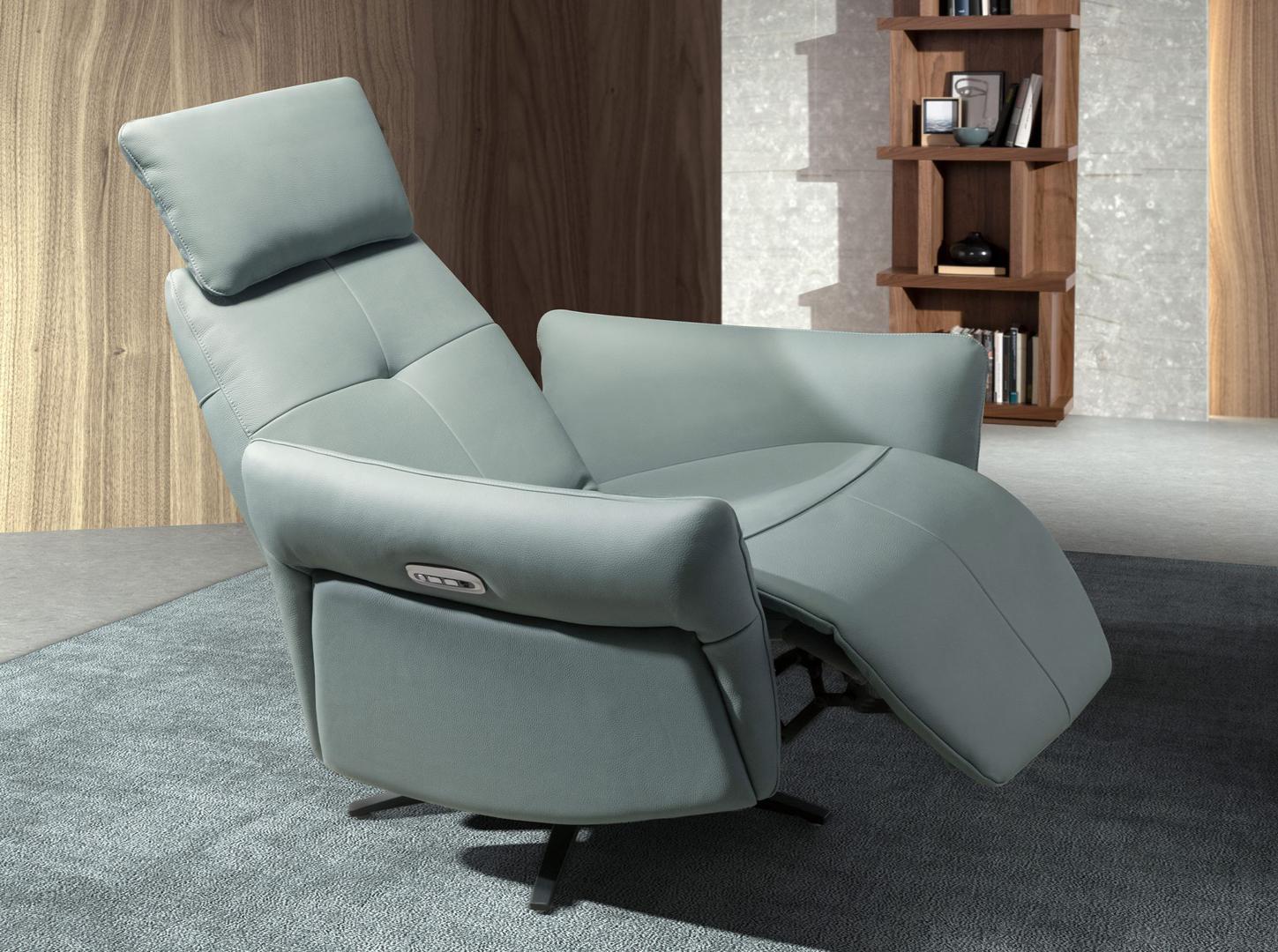 Вращающееся кресло для отдыха с подлокотниками современного дизайна, сиденье и спинка обиты бирюзово-зелёной воловьей кожей. Благодаря своему стилю и ножкам из нержавеющей стали с чёрным эпоксидным покрытием это вращающееся кресло для отдыха с электрическим механизмом отдыха идеально сочетает в себе стиль и комфорт.