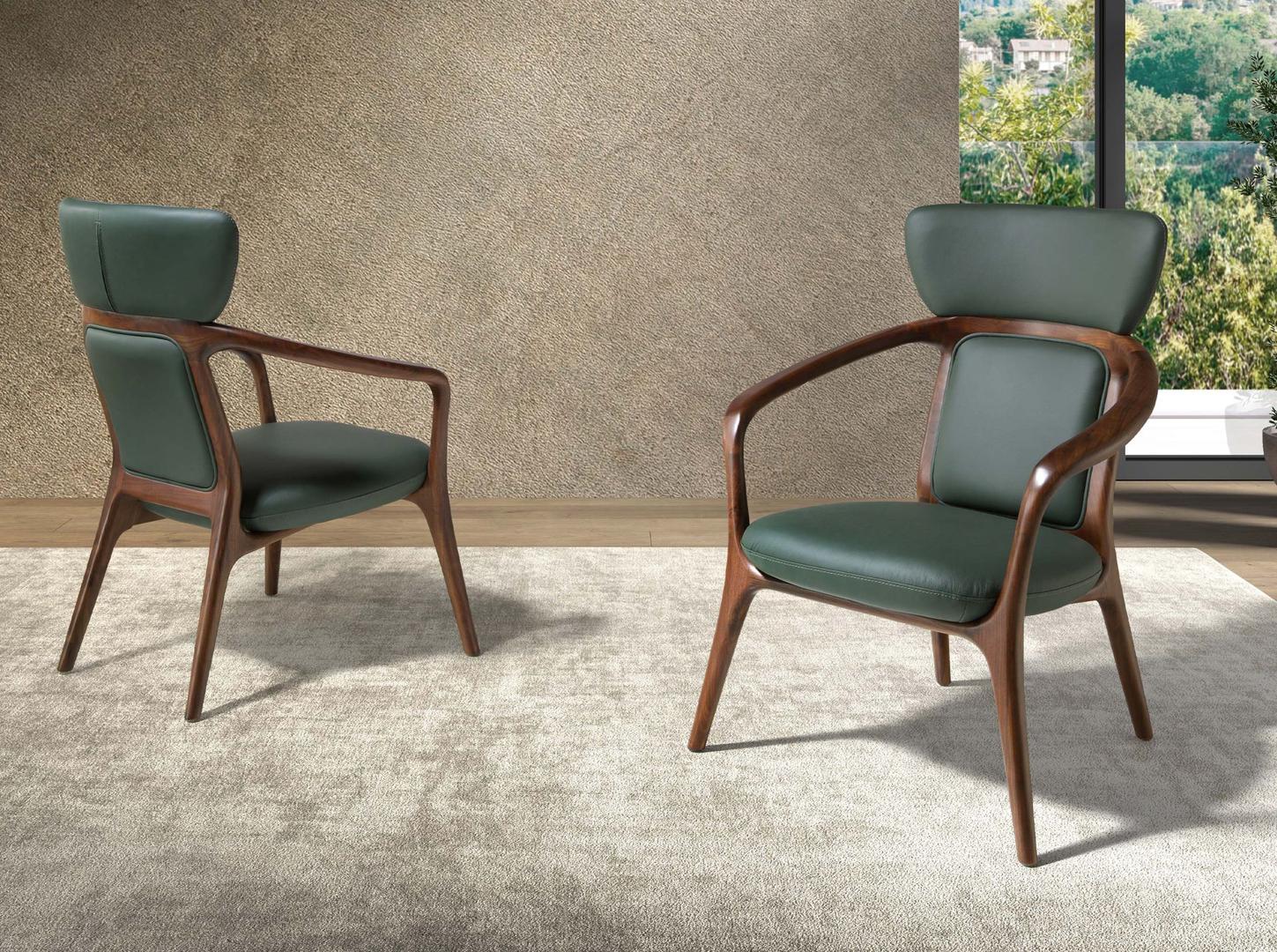 Кресло с современными подлокотниками, сиденьем и спинкой, обитыми темно-зеленой искусственной кожей. Благодаря своему стилю и деревянным ножкам цвета ореха, это кресло представляет собой идеальное сочетание дизайна и комфорта.