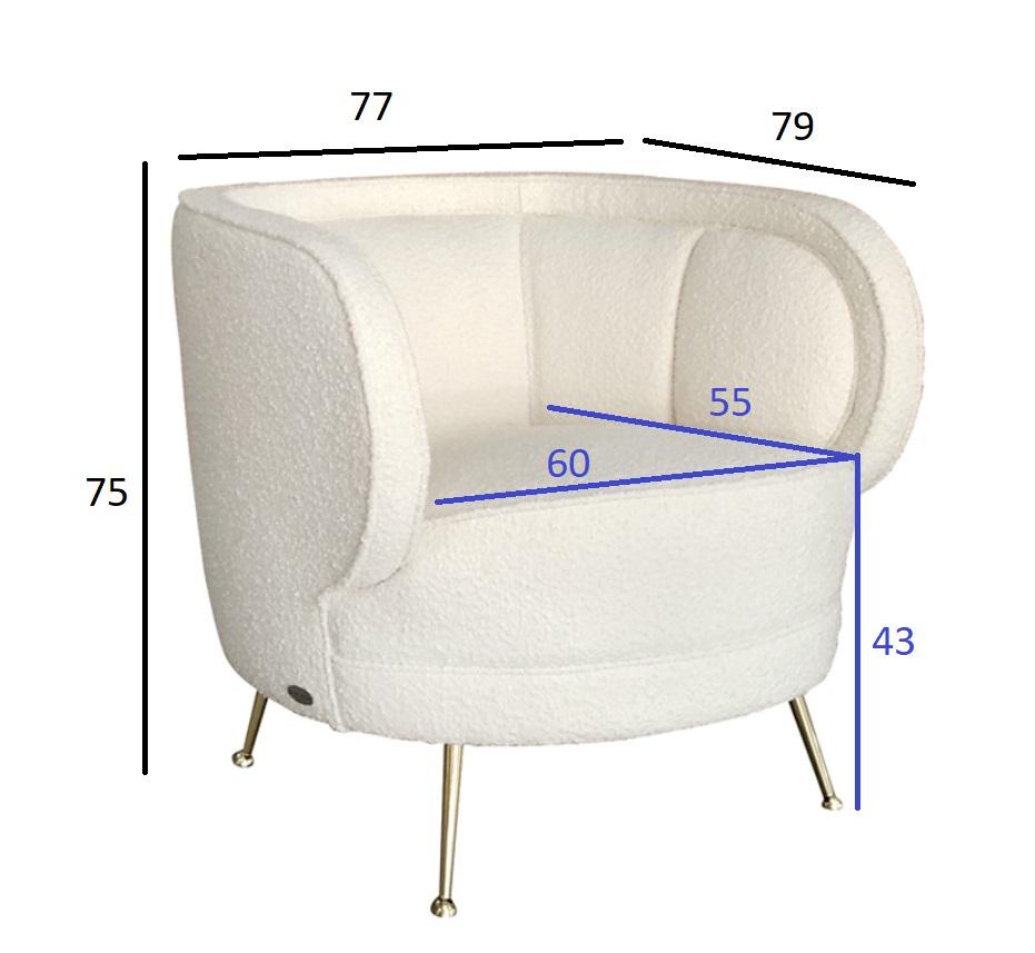 description-full - Европейский хит сезона! Уютное и изящное кресло с обивкой из буклированной ткани "барашек". Ведущие американские и европейские дизайнеры включают мягкие кресла и диваны в светлой буклированной ткани, имитирующей овечью шерсть, в свои коллекции. Мягкое и уютное кресло буквально обнимает вас с трех сторон, даря покой и негу. Тонкие слегка расставленные золотые ножки - аллюзия на остромодный стиль 60-х. Наполнитель пенополиуретан.