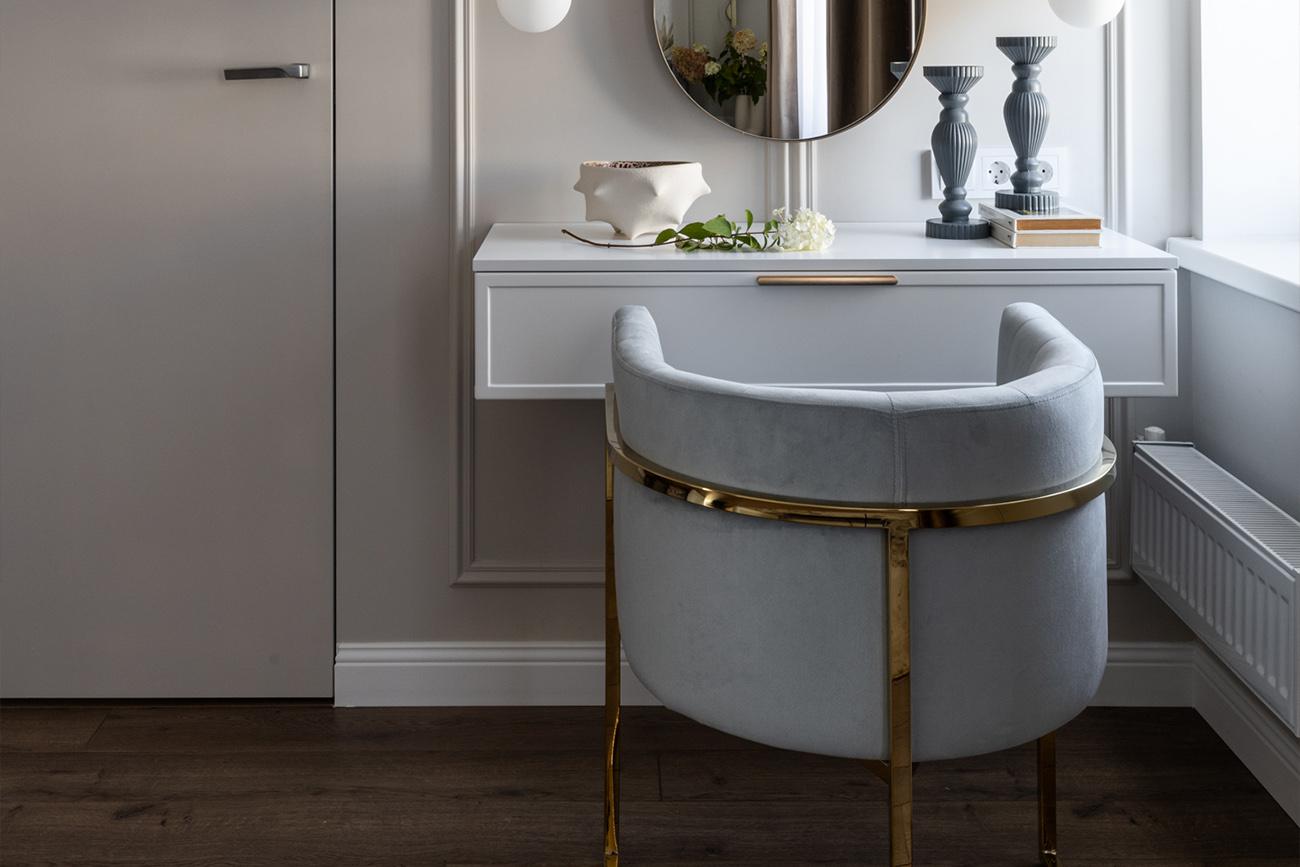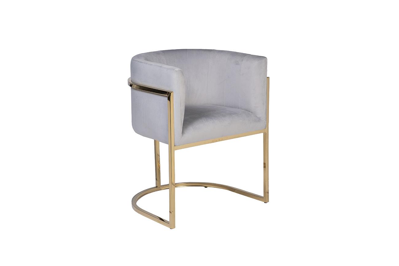 Удобное кресло с полукруглой спинкой из приятного серого велюра с легким голубым оттенком, на основании из позолоченной нержавеющей стали. Велюровое кресло на металлическом каркасе сочетает в себе благородный золотой блеск металла и мягкую текстуру велюра...