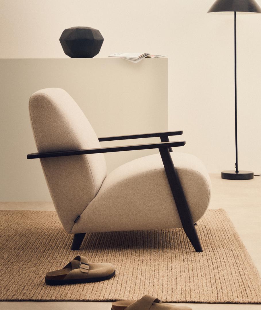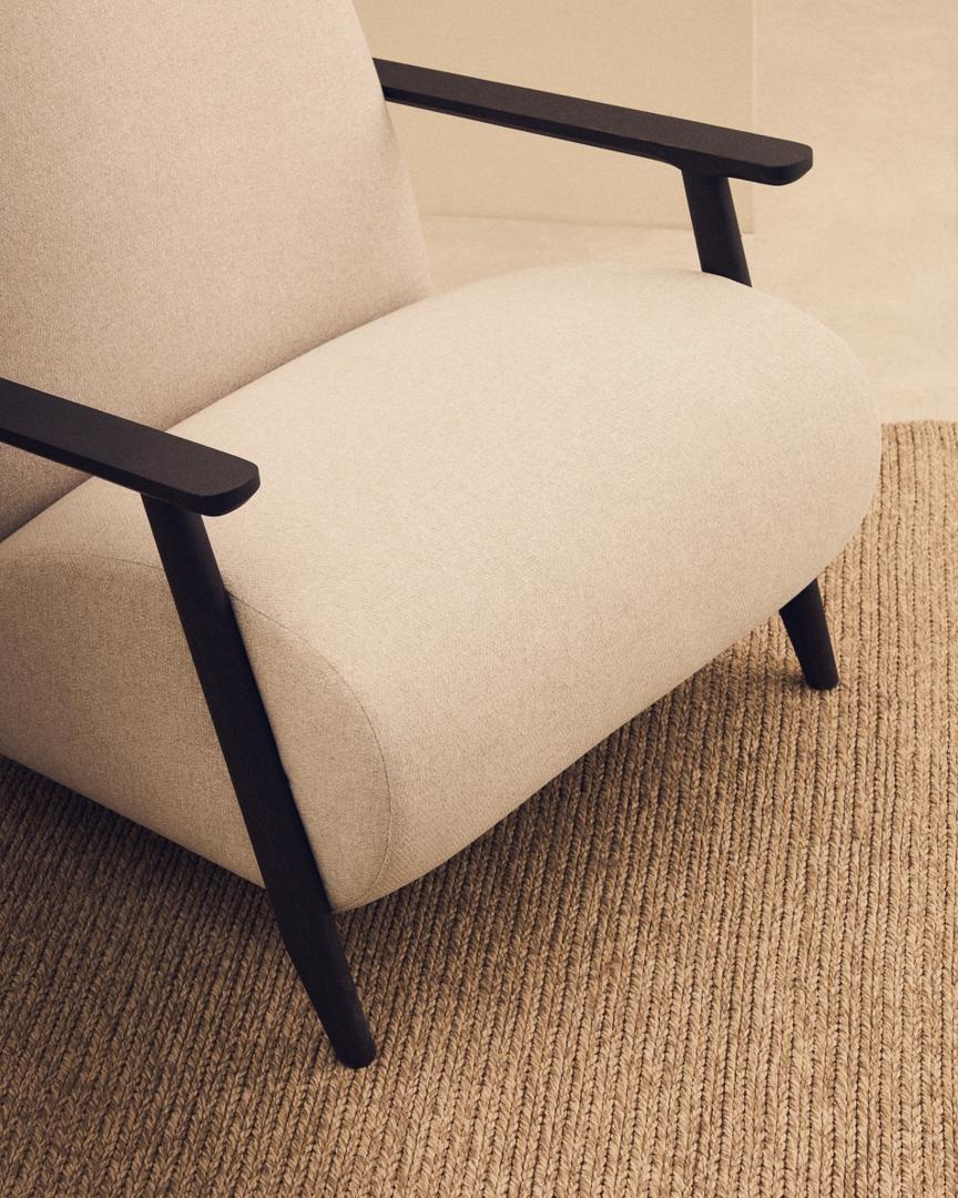Дизайн этого кресла минималистский, в расслабленном стиле, который сочетается с открытой рамой из массива ясеня. Его сиденье и спинка заполнены пеной, что придает ему средне-мягкую посадку, а его рама изготовлена из сосны и ДСП E0.