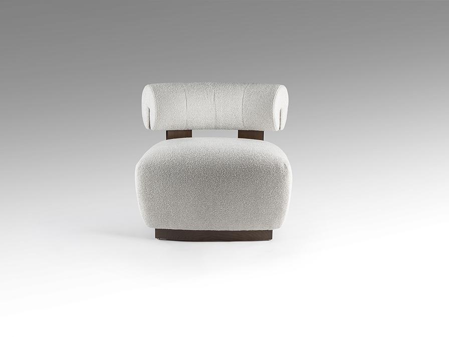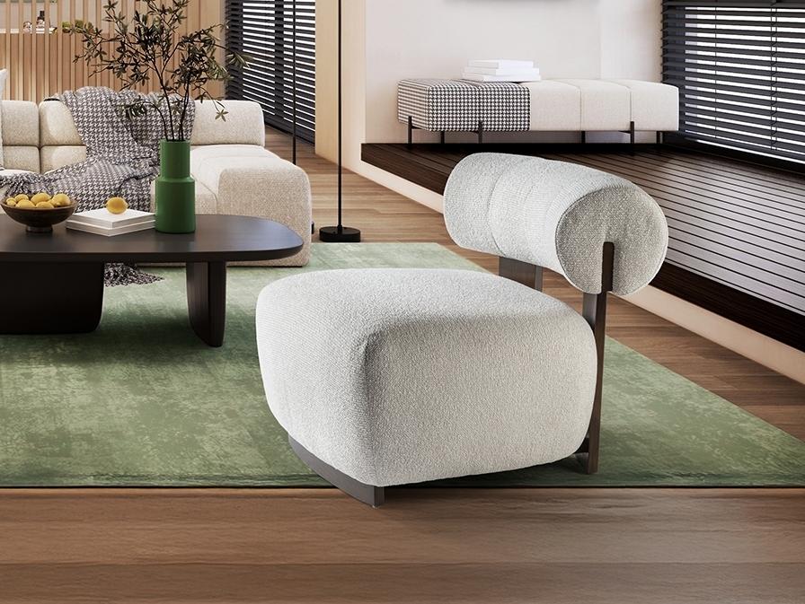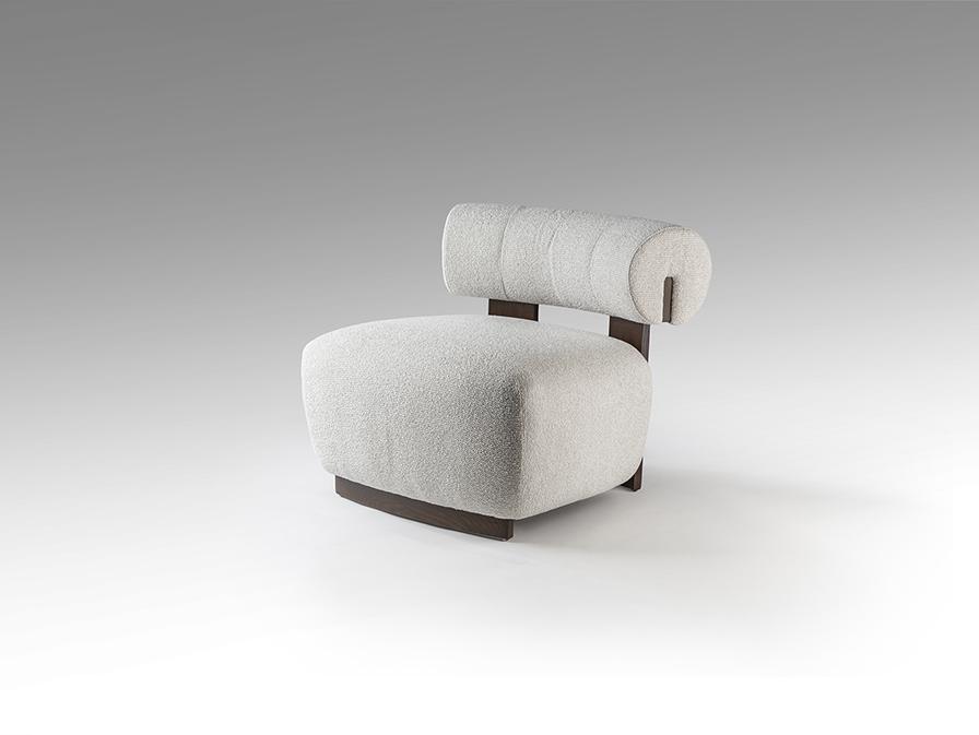 Кресло из дерева с черной отделкой и обивкой из шенилла цвета экрю.