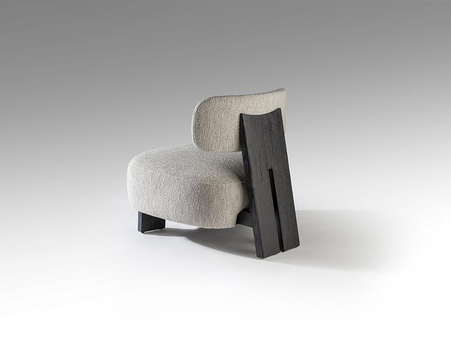 Кресло из дерева с черной отделкой и обивкой из шенилла цвета экрю.