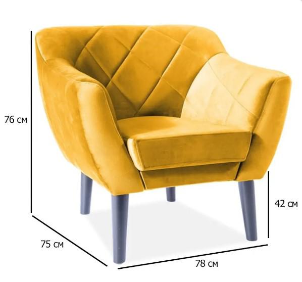 : ткань / Вес, кг: 15 / Высота (см): 76 / Гарантия, мес.: 12 / Глубина (см): 75 / Глубина сиденья (см): 54 / Количество коробок: 1 / Материал каркаса: дерево / Материал сидения: велюр / Необходимость сборки: да / Размер упаковки 1: 0,7/0,78/0,47 / Страна производитель: Польша / Цвет: карри / Ширина (см): 78