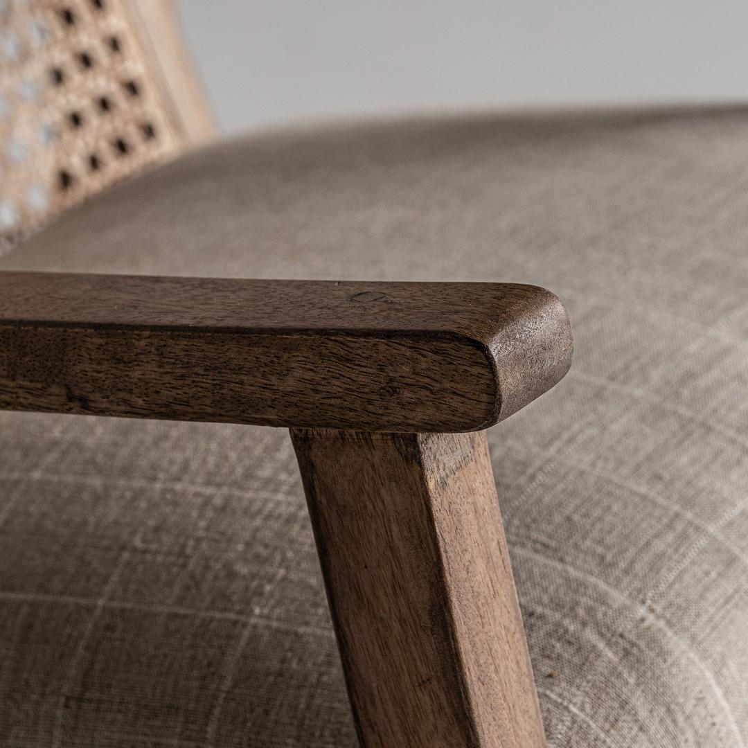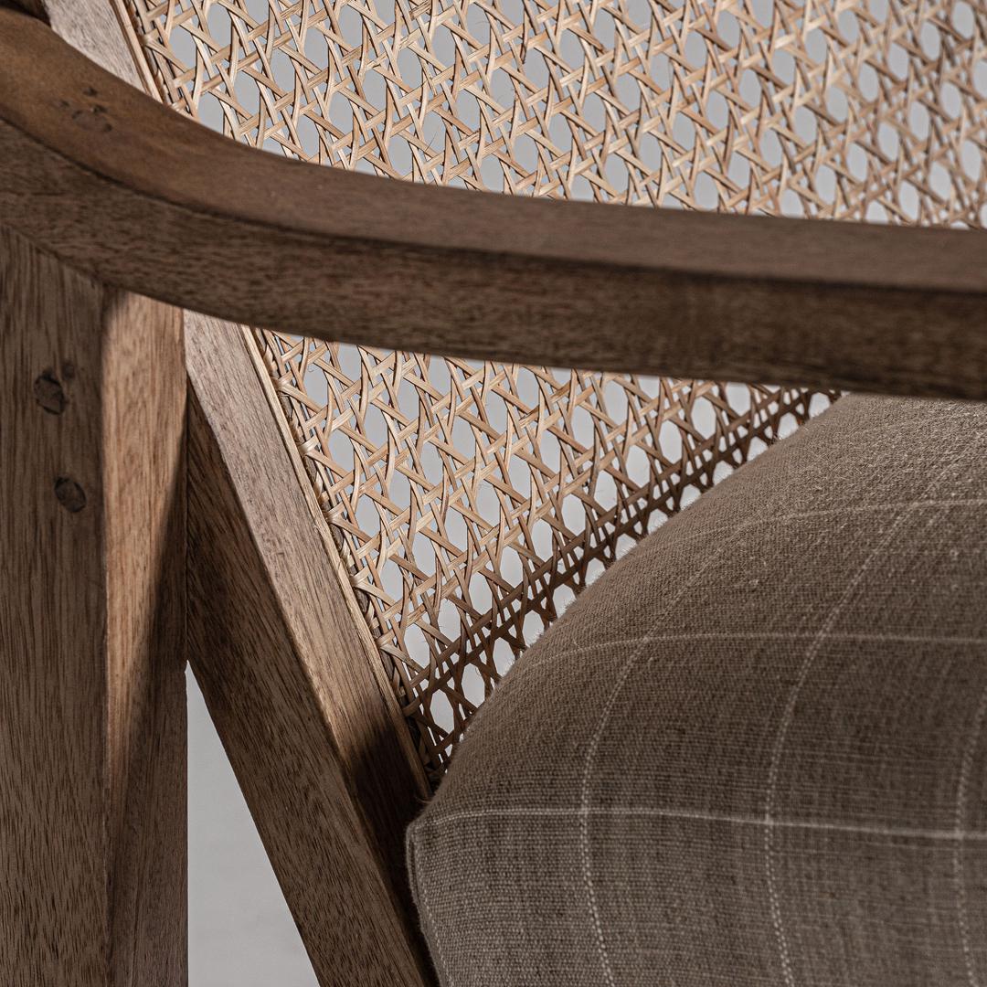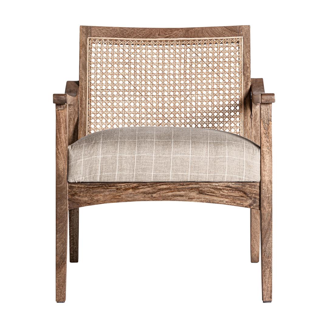 Кресло Valhey, натурального цвета, колониальный стиль. Изготовлен из древесины манго в сочетании с полиэстером и ротангом.