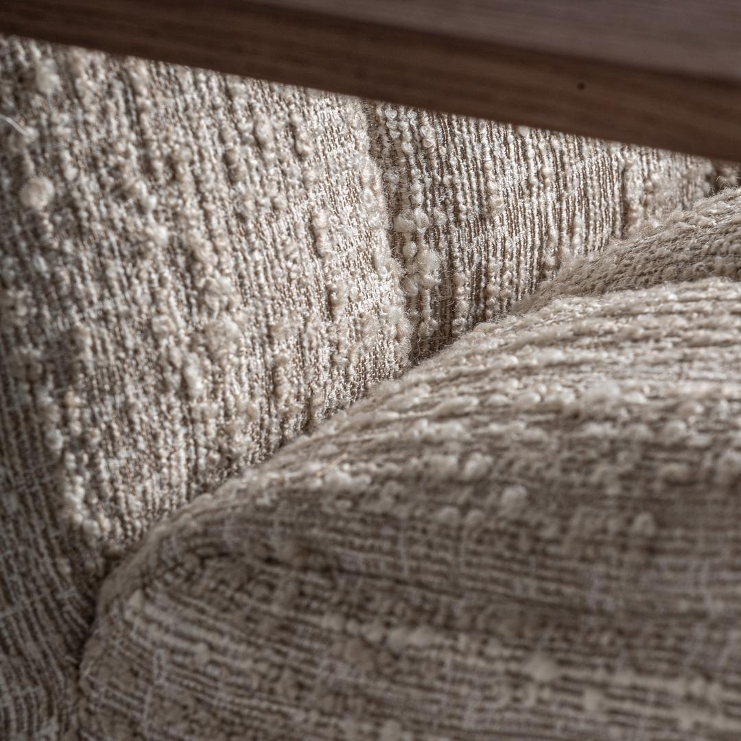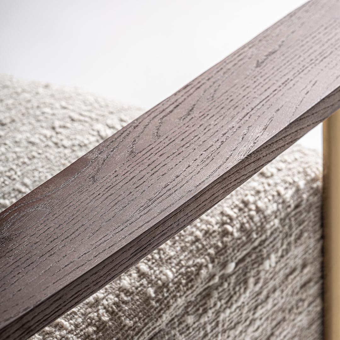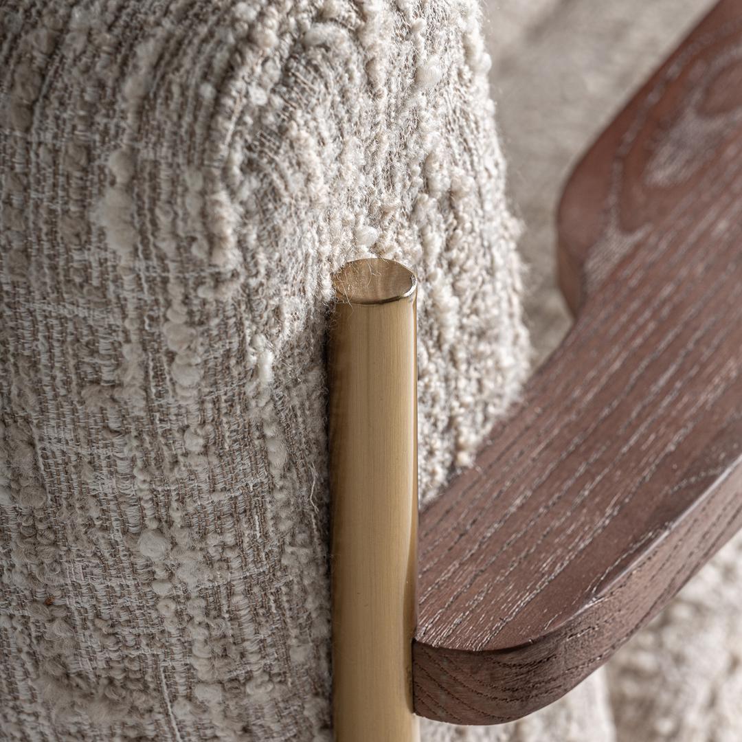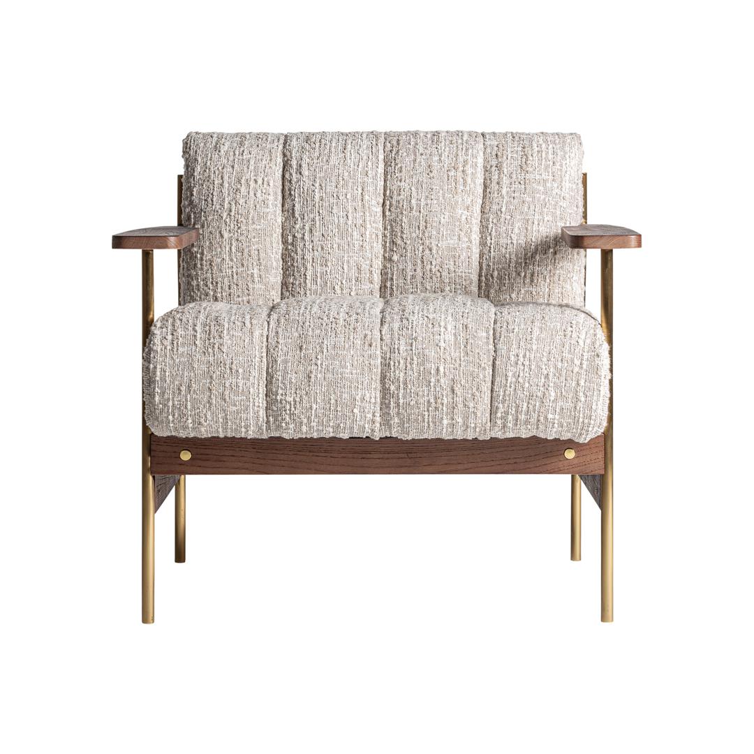 Кресло из полиэстера в бежевый тонах в сочетании с коричневой сосной и сталью золотистого цвета.