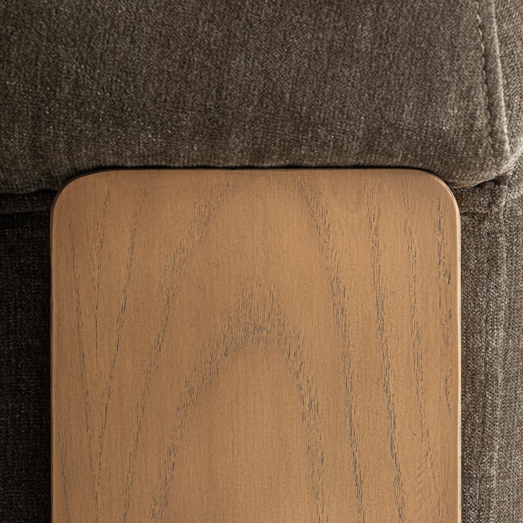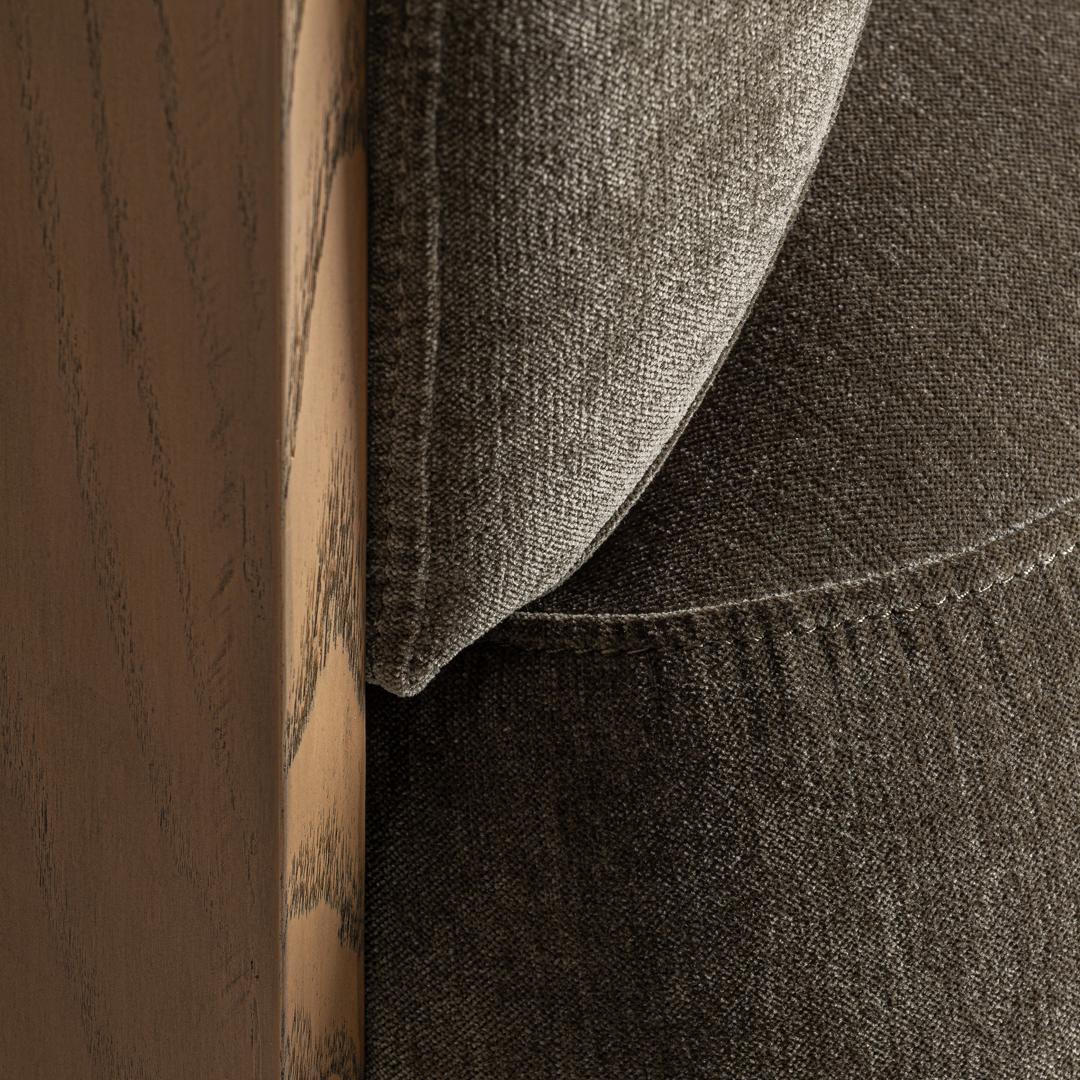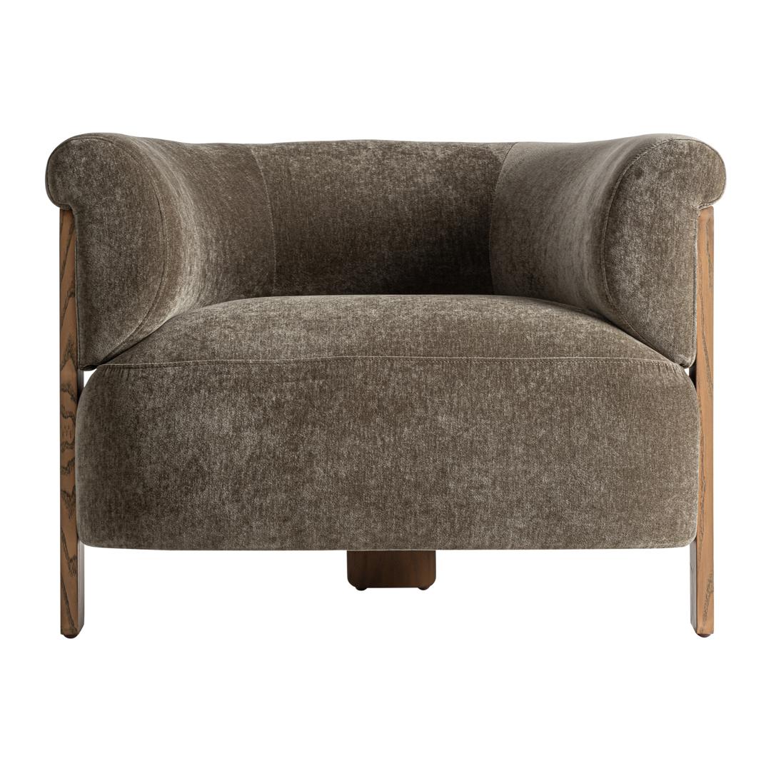 Кресло, изготовленное из зеленого полиэстера с отделкой из синели, в сочетании с коричневой сосновой древесиной и пенополиуретаном. Ширина: 96 см, Глубина: 86 см, Высота: 70 см