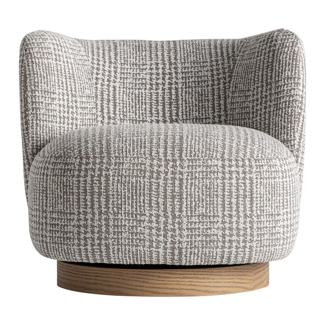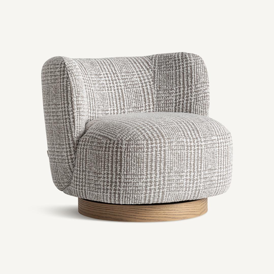 Кресло, изготовленное из зеленого полиэстера с пятнистой текстурой, в сочетании с коричневой сосновой древесиной и пенополиуретаном. Ширина: 85 см, Глубина: 85 см, Высота: 75 см