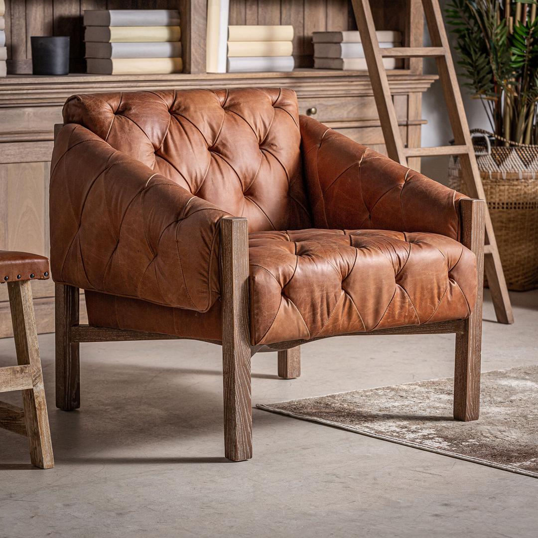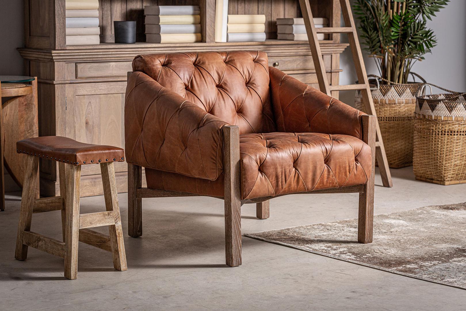 Кресло GLINSK, коричневый цвет, винтажный стиль. Изготовлен из древесины березы в сочетании с кожей и поролоном.