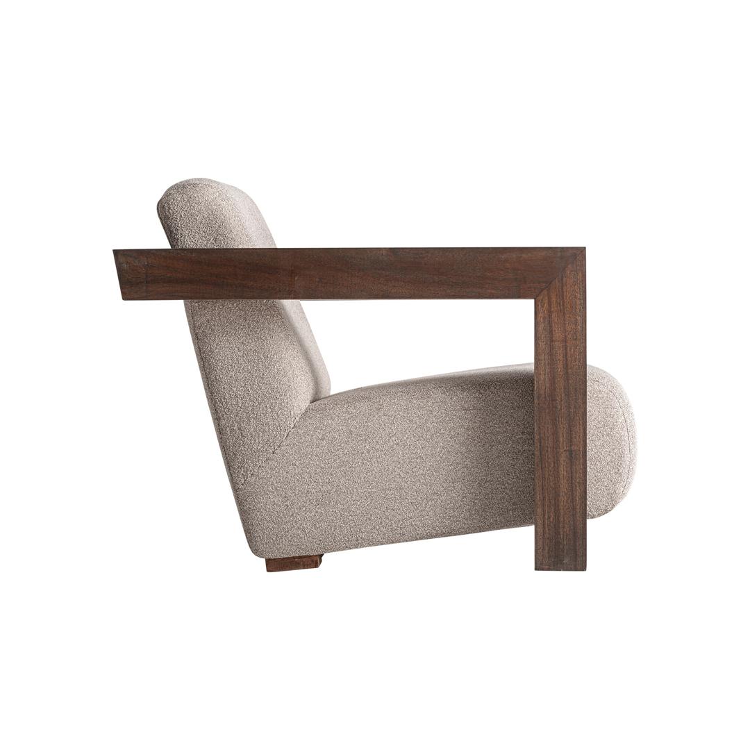 Кресло, изготовленное из полиэстера кремового цвета в сочетании с коричневой древесиной минди и пенополиуретаном. Ширина: 80 см, Глубина: 88 см, Высота: 69 см