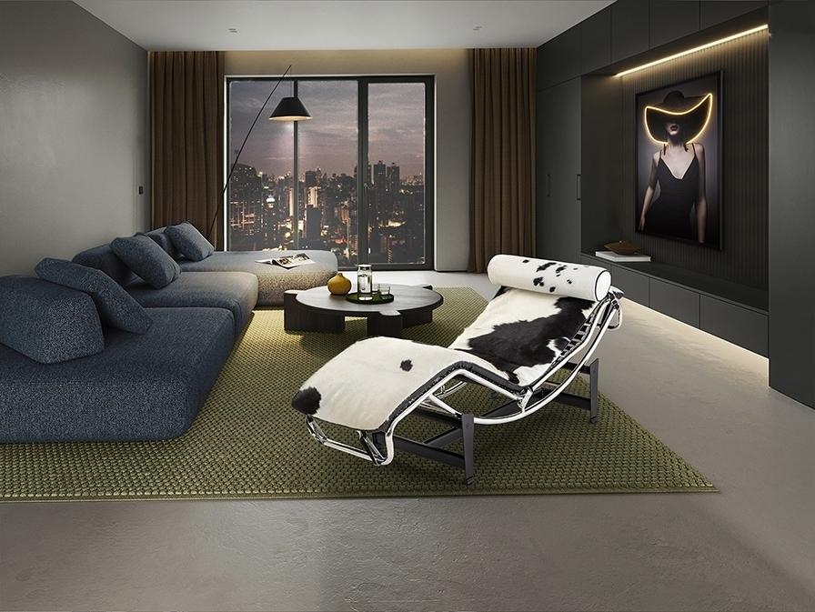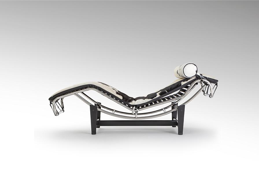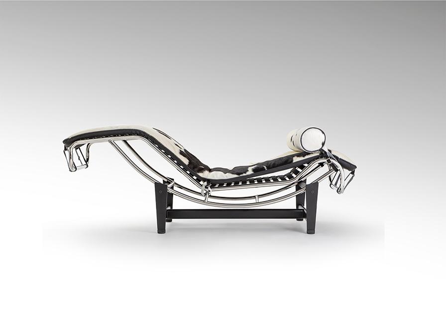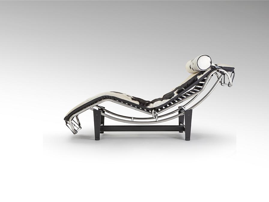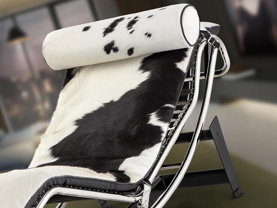 Шезлонг, каркас из хромированной стали, основание из металла чёрного цвета. Откидное сиденье, обитое спереди натуральной коровьей кожей с чёрно-белым пятном, сзади – экокожей.