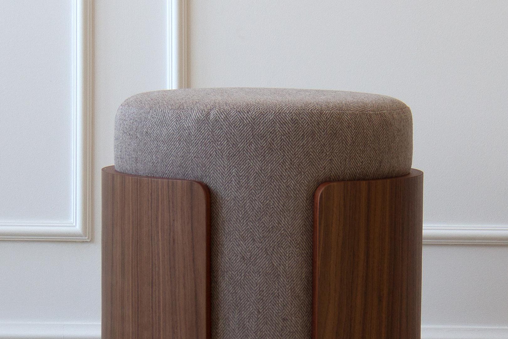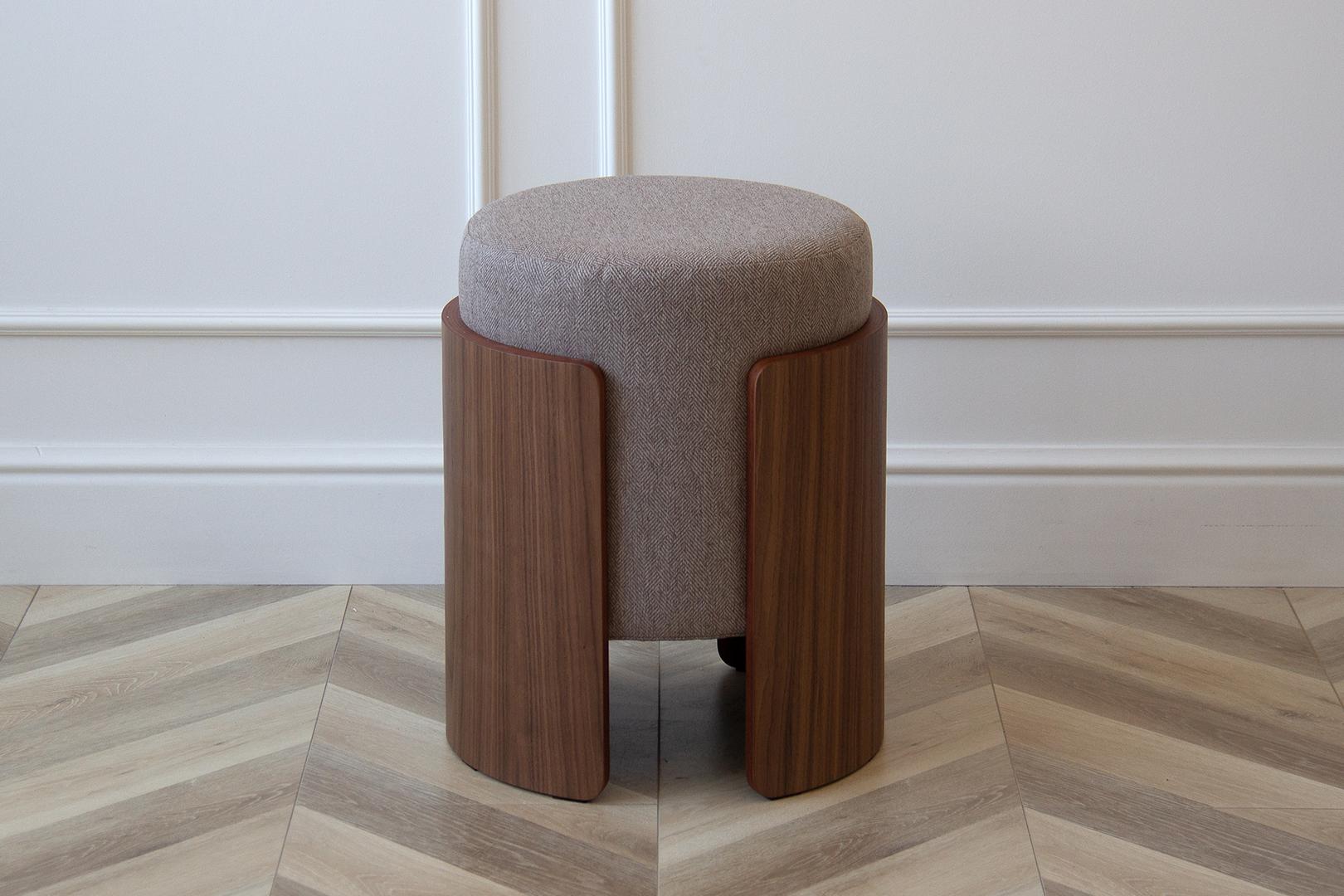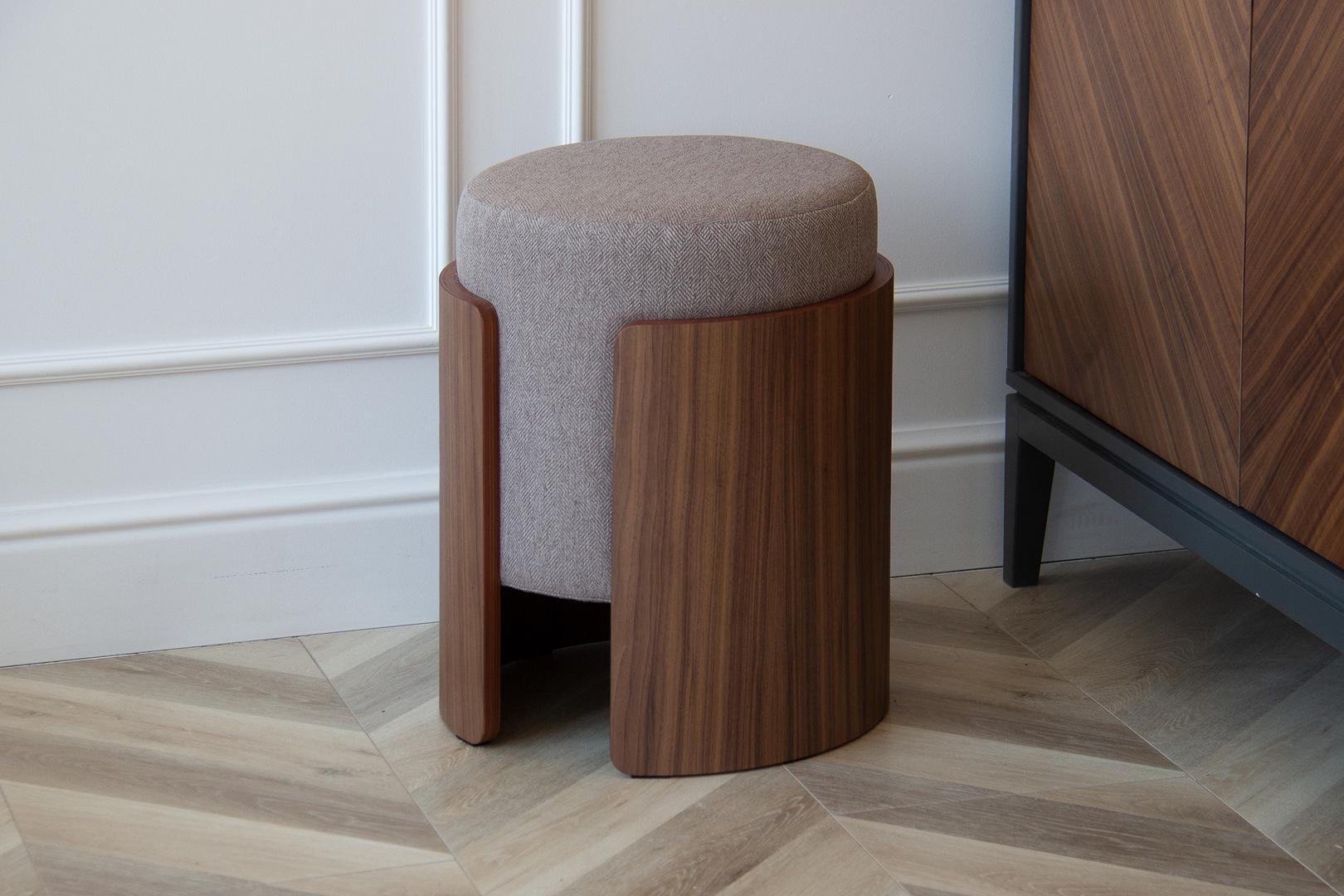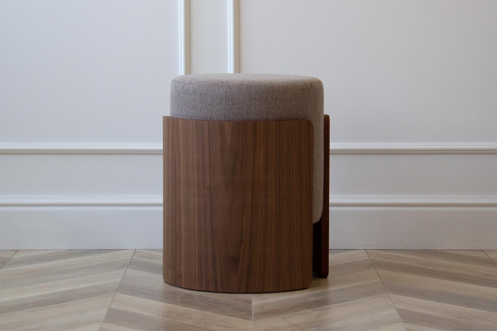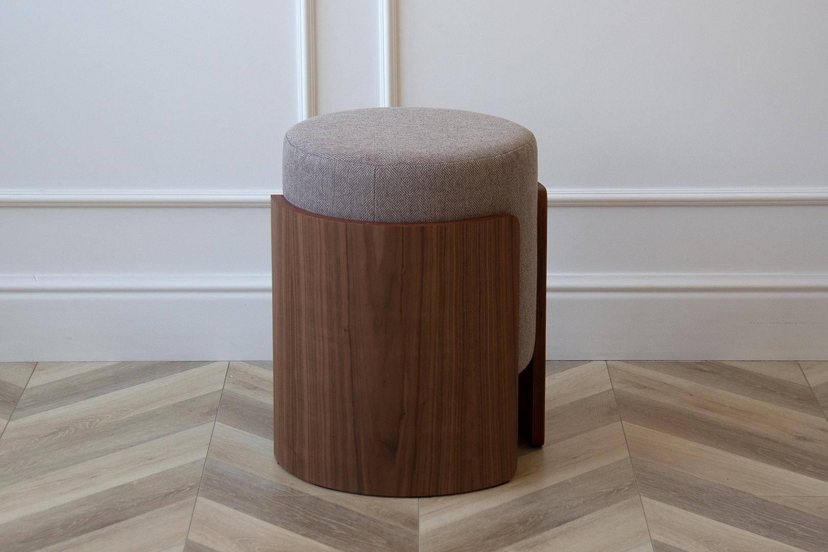 Комфортный мягкий пуф дополнит интерьер гостиной, спальни или прихожей Каркас: фанера, шпон ореха Обивка: ткань твид Габариты: d 39 см, высота 44 см Вес: 9 кг