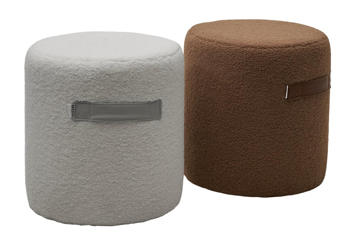 Пуф обит мягкой тканью, напоминающую шерсть молодого ягненка. Ручки из экокожи.