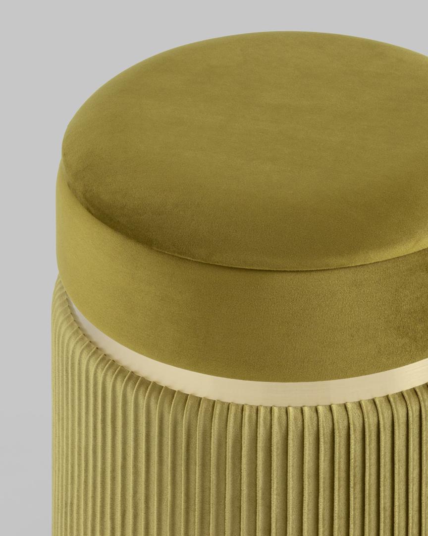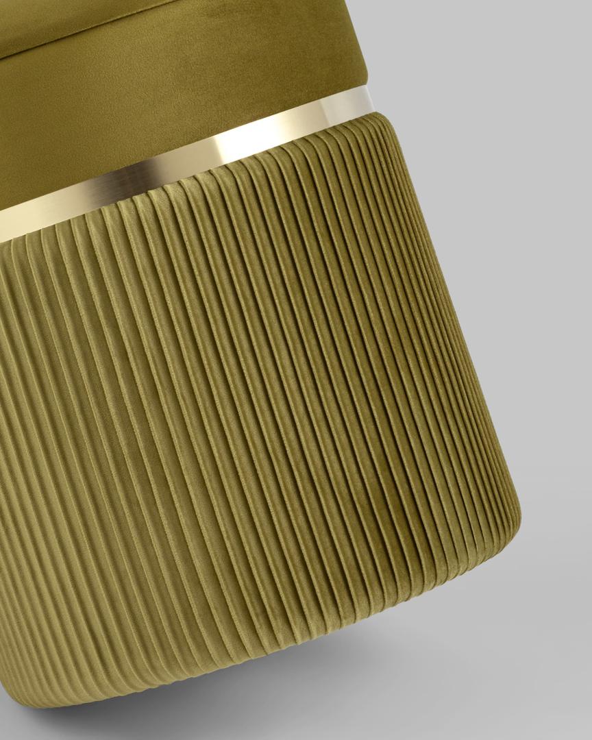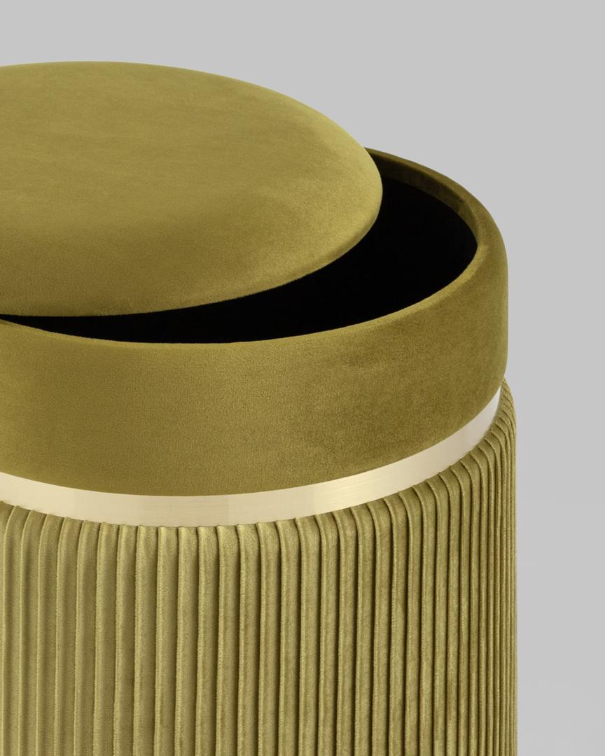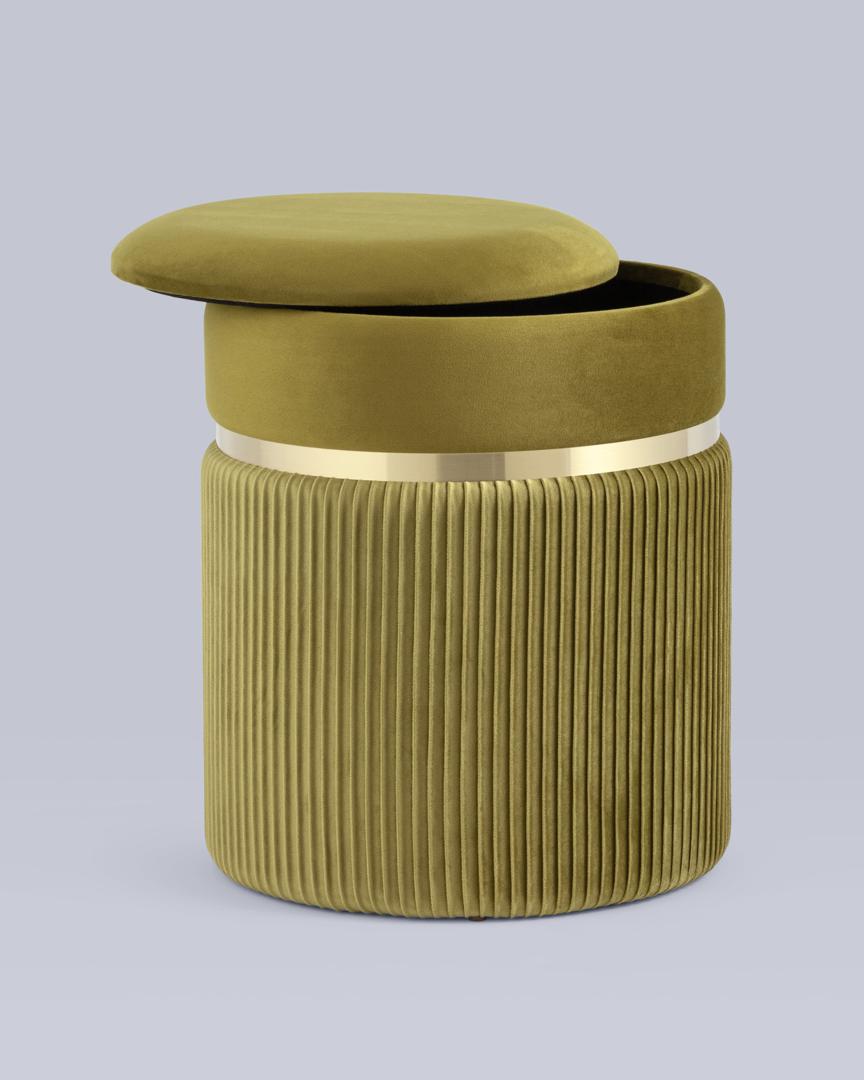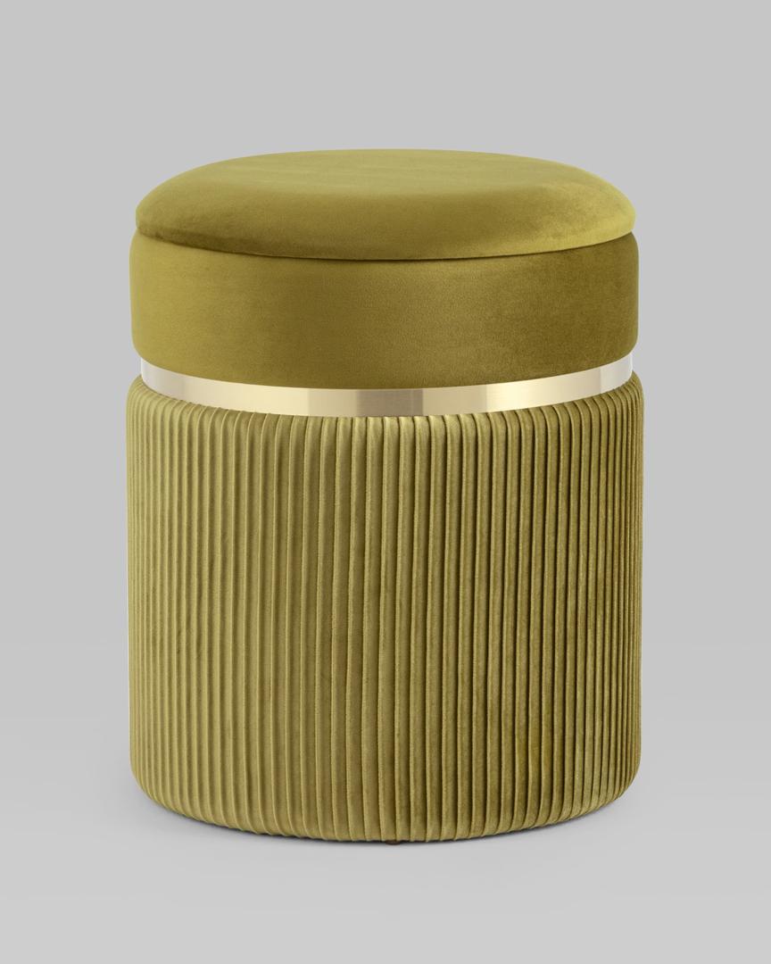 Пуф Миранда с ящиком велюр оливковый с декоративным золотым ободком