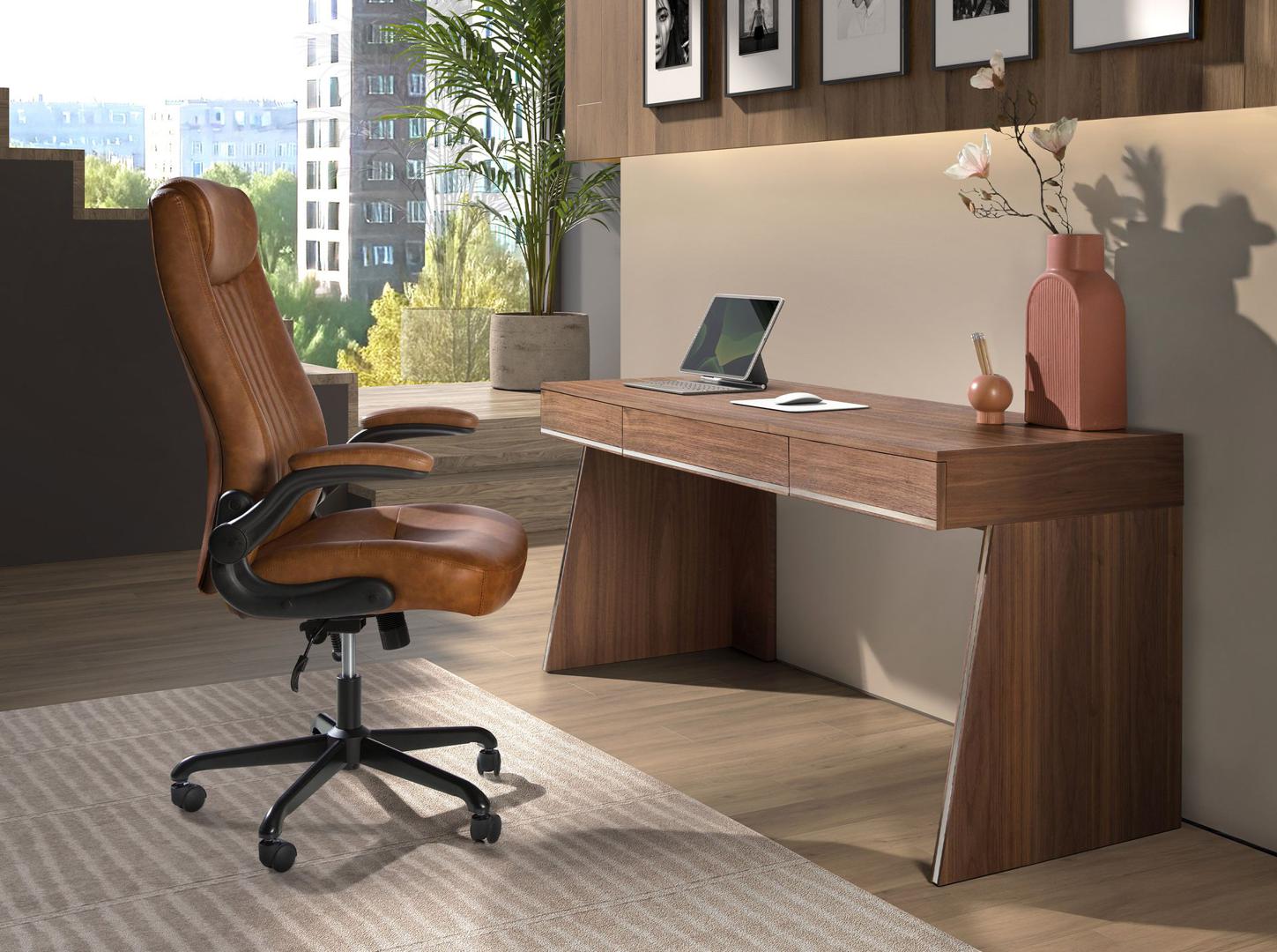 Современное поворотное офисное кресло с сиденьем и спинкой, обитыми коричневой искусственной кожей. Оно оснащено подлокотниками для большего комфорта. Благодаря ножкам из черной нержавеющей стали и регулируемой по высоте подставке, оно станет незаменимым элементом вашего рабочего места, не жертвуя при этом самым авангардным стилем. Колесики обеспечивают дополнительную практичность, необходимую во время работы или учебы.