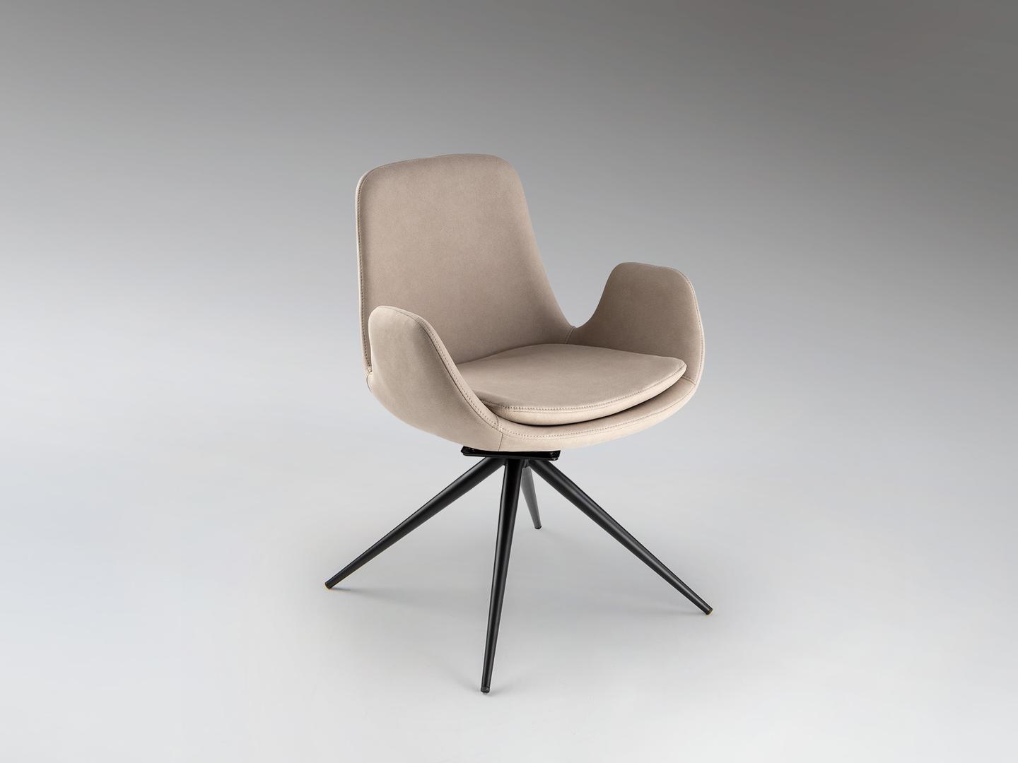 Вращающееся кресло, металл, матово-черная отделка. Сиденье и спинка из фанеры и пены. Поворотный механизм с автоматическим возвратом. Обивка из 100% полиэстера бежевого цвета. Химчистка