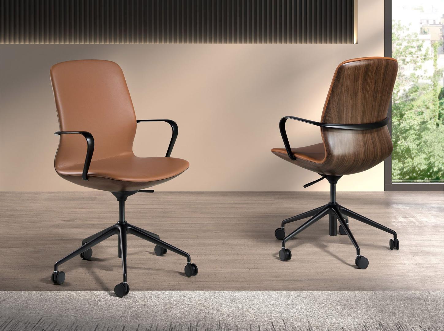 Современное поворотное офисное кресло с сиденьем и спинкой, обитыми коричневой искусственной кожей. Оно оснащено подлокотниками для большего комфорта. Благодаря ножкам из черной нержавеющей стали и регулируемой по высоте подставке, оно станет незаменимым элементом вашего рабочего места, не жертвуя при этом самым авангардным стилем. Колесики обеспечивают дополнительную практичность, необходимую во время работы или учебы.