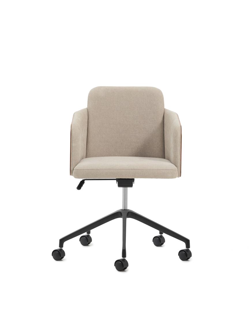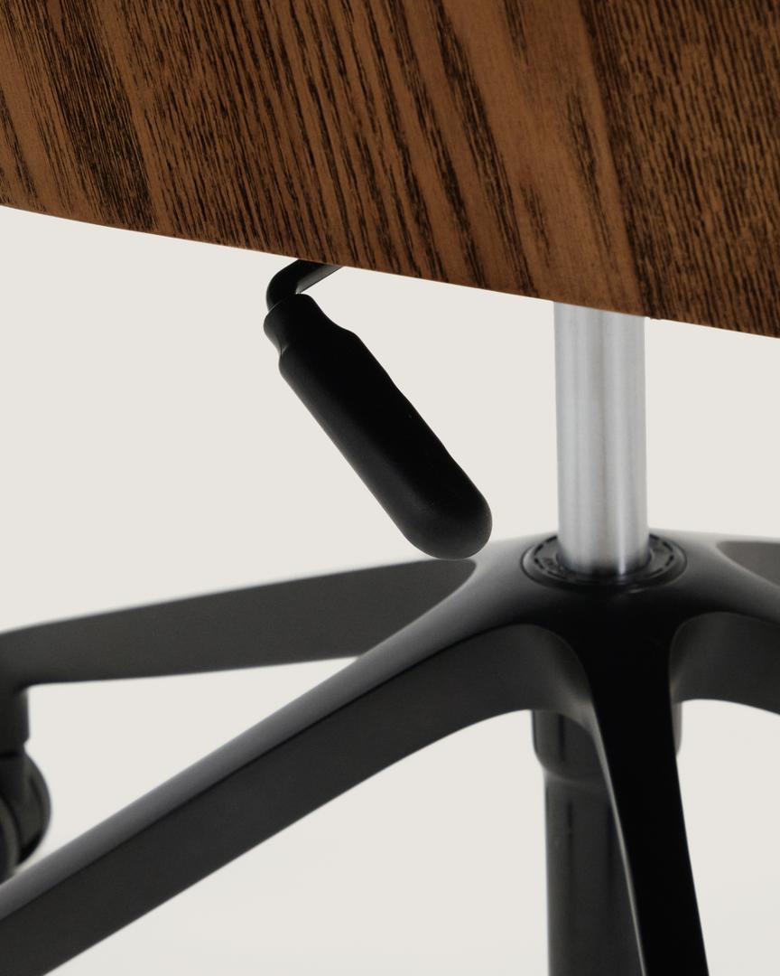 Рабочий стул Madai из ясеневого шпона с обивкой из шенилла сочетает в себе дизайн и комфорт в изделии, предназначенном для повседневного использования. Ясеневый шпон сертифицирован FSC Mix Credit и изготовлен из смеси материалов, полученных из сертифицированных FSC лесов и контролируемой FSC древесины. Основание и ножки из матового чёрного алюминия покрыты термореактивным лаком, устойчивым к царапинам. Полиуретановые колёса защищают пол от царапин и оснащены системой амортизации, обеспечивающей устойчивость и управляемость во время катания.