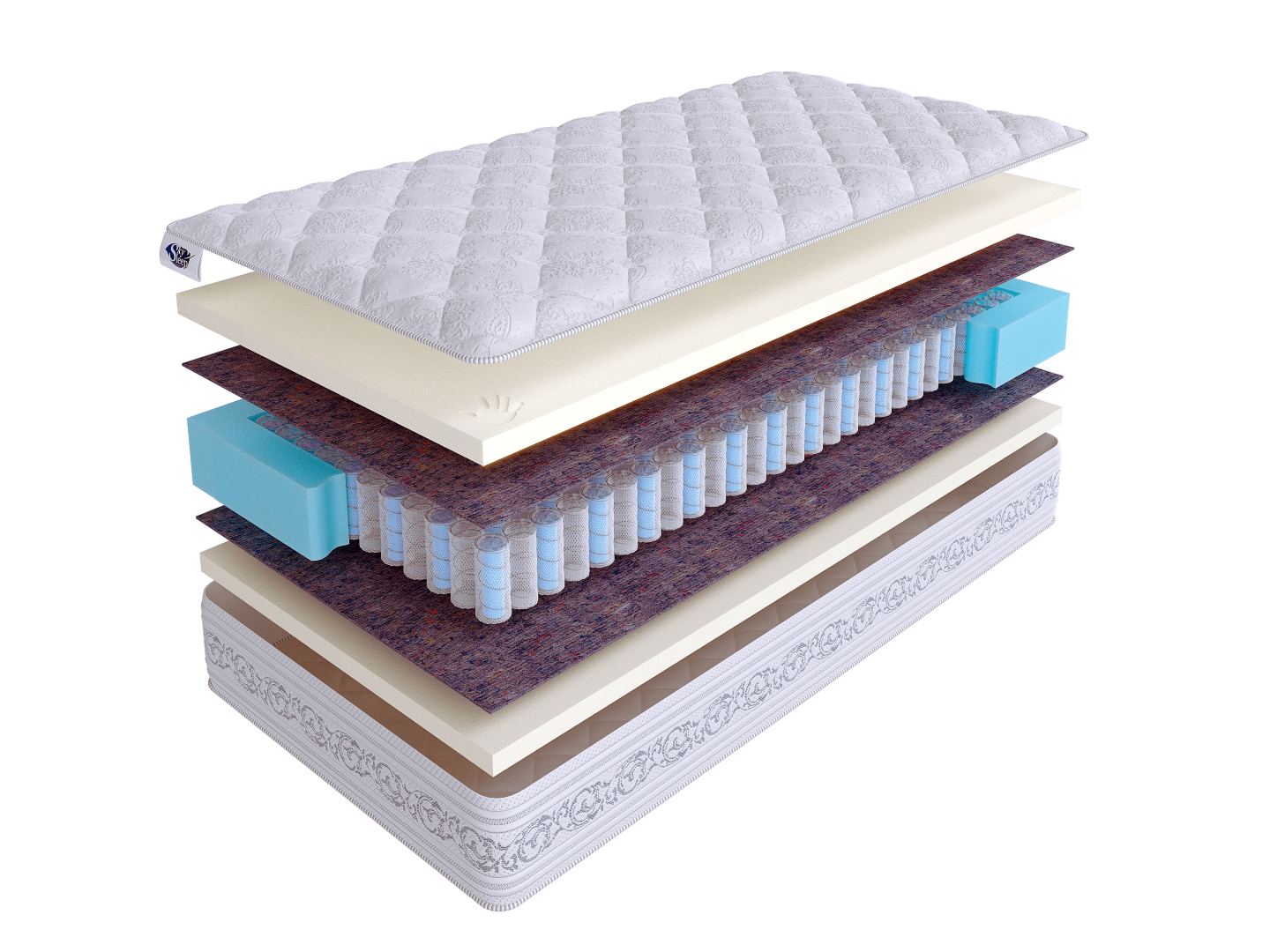 Чехол матраса выполнен из качественного хлопкового трикотажа с глубоким рельефным рисунком, простеганный на объемном шерстипоне 450 г/кв. м